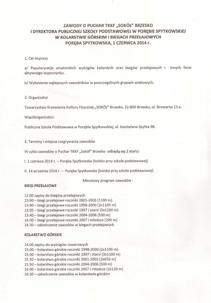 Zawody odbędą się w niedzielę 1 czerwca 2014 r. na terenach zielonych przy szkolew Porębie Spytkowskiej. Biuro zawodów czynne od godz. 12.00.