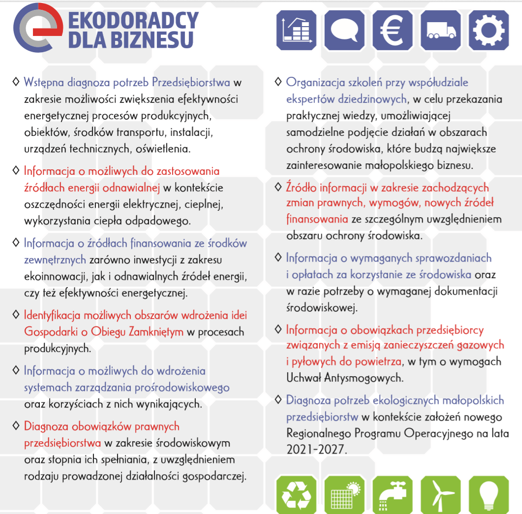 W ramach projektu wprowadza się ekodoradców dla biznesu. Pomogą oni obniżyć koszty prowadzenia działalności m.in. poprzez: zwiększenie efektywności energetycznej procesów produkcyjnych i pomieszczeń, zminimalizowanie powstawania odpadów i wprowadzenie zasad gospodarki o obiegu zamkniętym. Ekodoradcy dla biznesu wskażą na możliwości pozyskania środków finansowych na wsparcie innowacji i modernizacji w celu ograniczenia negatywnego wpływu na środowisko oraz będą wsparciem w zakresie dostosowania przedsiębiorstw do wymagań środowiskowych i przepisów prawnych.