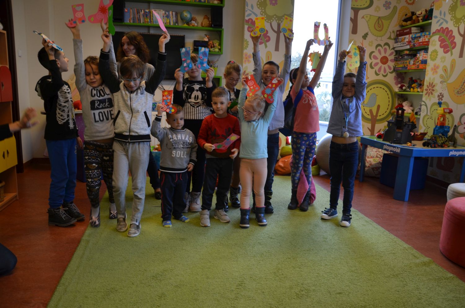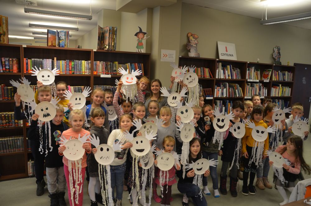 Tegoroczne ferie w bibliotece były przeprowadzone w oparciu o książki o skarpetkach Justyny Bednarek. Podczas prowadzonych warsztatów w trakcie pierwszego tygodnia dzieci wzięły udział w wielu grach, zabawach, pracach plastycznych połączonych z ciekawymi wyjściami. Zachęceni historią malinowej skarpetki i dziewczynki, która poleciała w kosmos zorganizowano zajęcia podczas, których odkrywano tajemnice wszechświata. We wtorek dzieci udały się do salonu kosmetycznego dla zwierząt, gdzie groomerka Pani Dorota Klara opowiedziała o swojej pracy oraz pokazała wyposażenie swojego salonu. Inspiracją do tej wycieczki była skarpetka różowa, która pocieszyła psa. Kolejne zajęcia poświęcone były superbohaterom. Wspólnie wykonywano wiele zabawnych gier i zabaw sprawdzających czy uczestnicy posiadają potrzebne wszystkim bohaterom cechy takie jak ; superzwinność, superwzrok, superwiedzę i superszybkość. Podczas kolejnych warsztatów tworzono kwiaty z papieru i bibuły, poznając tajniki hodowli i pielęgnacji róż. Temat ten podsunięty został przez czerwoną skarpetkę, która wygrała konkurs na najpiękniejszy kwiat. Pierwszy tydzień zakończono upiornymi zajęciami o duchach, zjawach i potworach do których zainspirowała historia starej, białej, pocerowanej czarną nitką skarpetki.