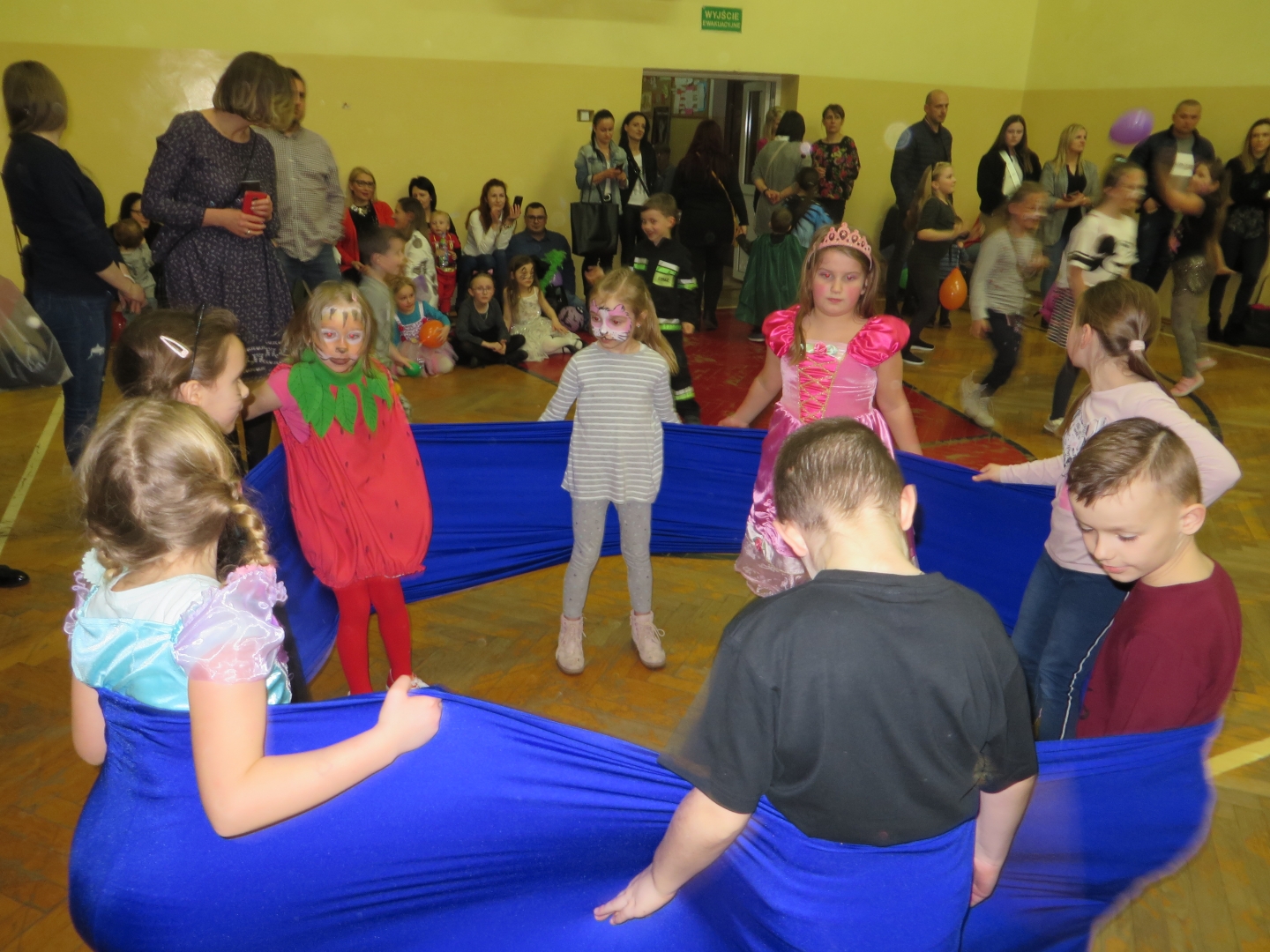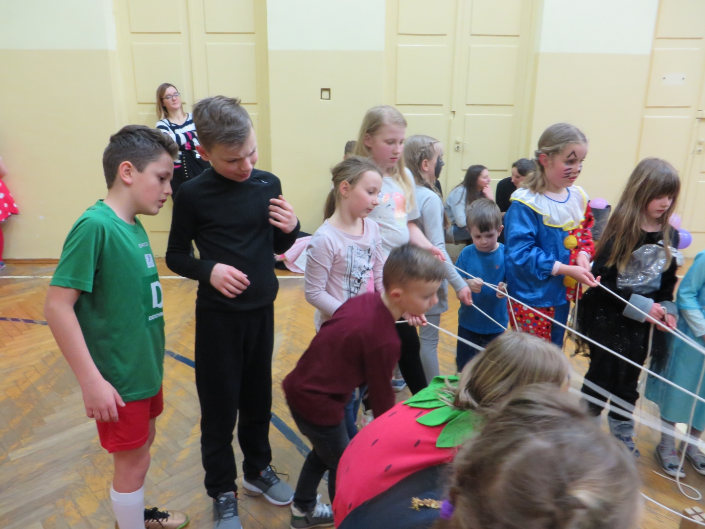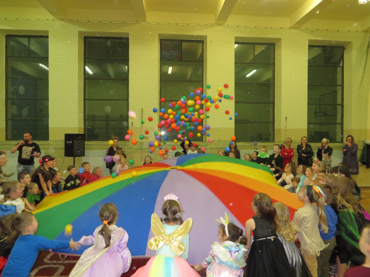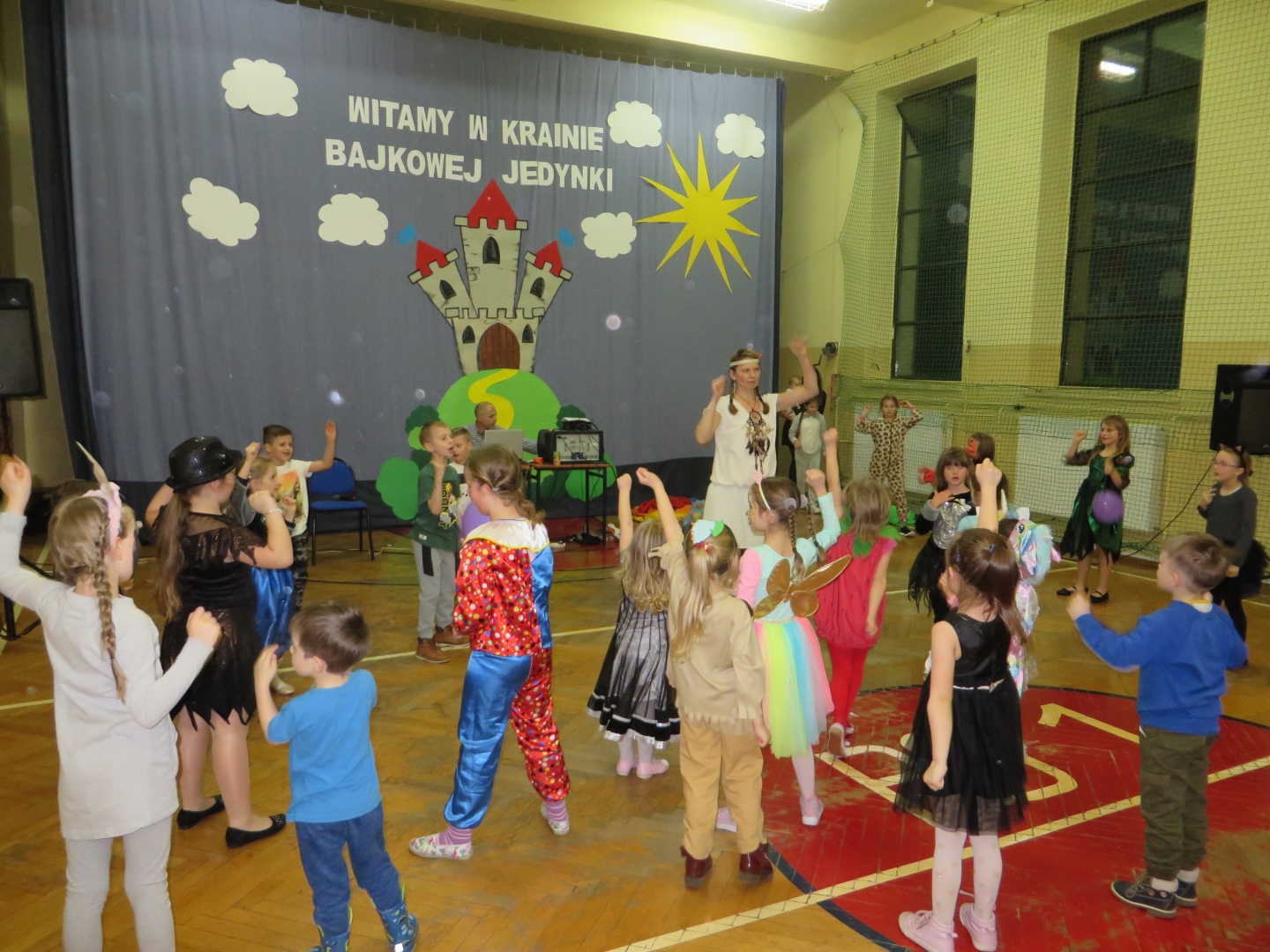 Kiedy nastał czas balu, na parkiet przybyli uczniowie w fantazyjnych, kolorowych strojach. Tu czekały na nich nie tylko tańce, ale także wesołe konkurencje, w których nikt nie przegrywał. Animatorki –p. Beata Hermaszewska i p. Aneta Szczupak wyśmienicie zadbały o to, by z dziecięcych twarzy nie schodził szeroki uśmiech.