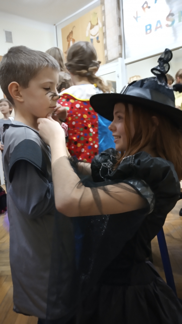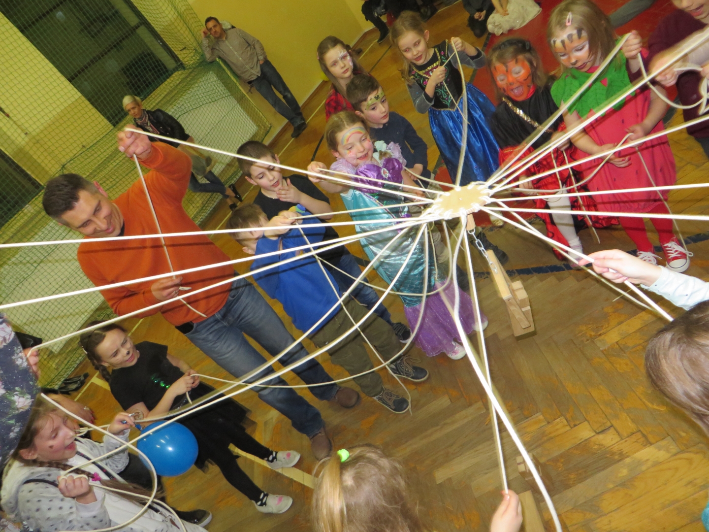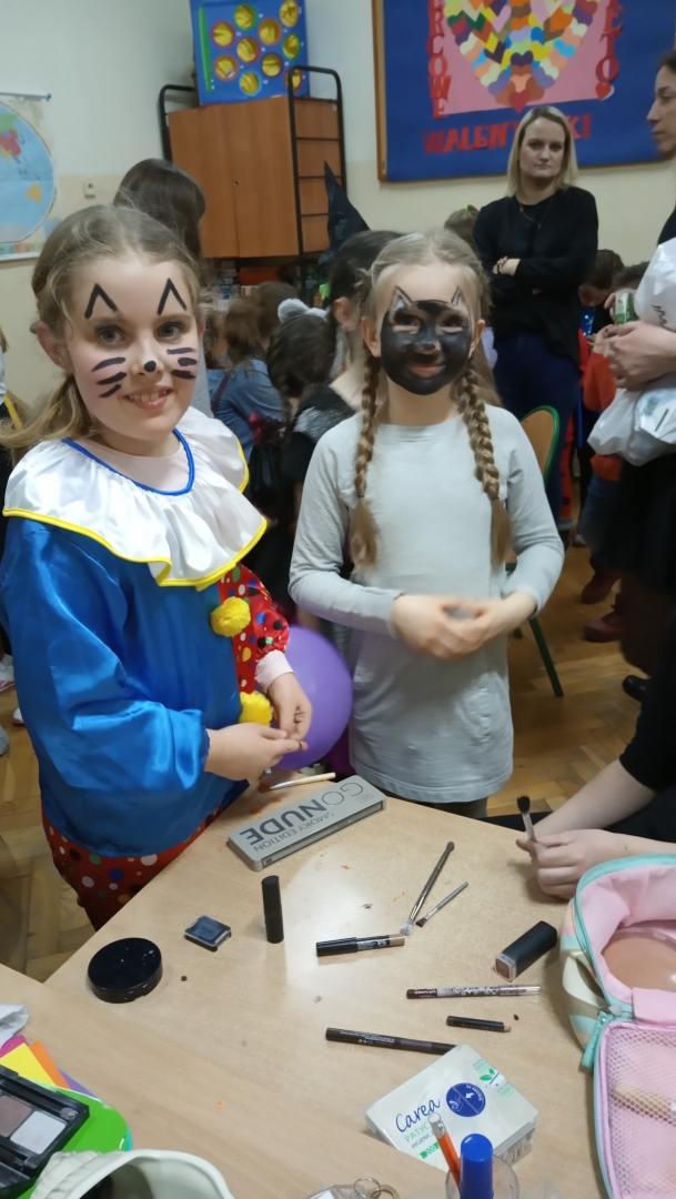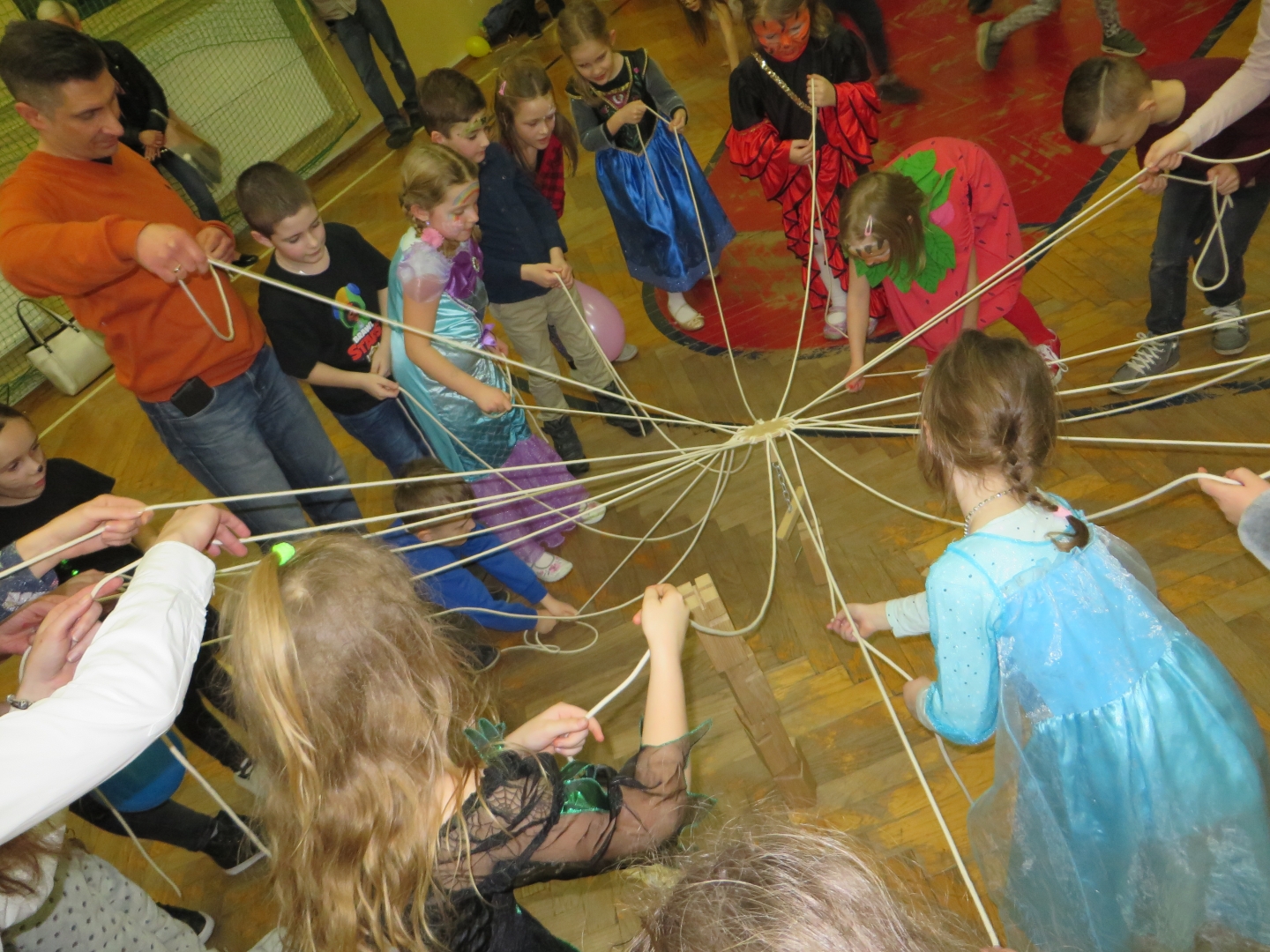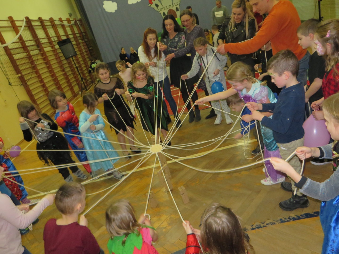 Kiedy nastał czas balu, na parkiet przybyli uczniowie w fantazyjnych, kolorowych strojach. Tu czekały na nich nie tylko tańce, ale także wesołe konkurencje, w których nikt nie przegrywał. Animatorki –p. Beata Hermaszewska i p. Aneta Szczupak wyśmienicie zadbały o to, by z dziecięcych twarzy nie schodził szeroki uśmiech.