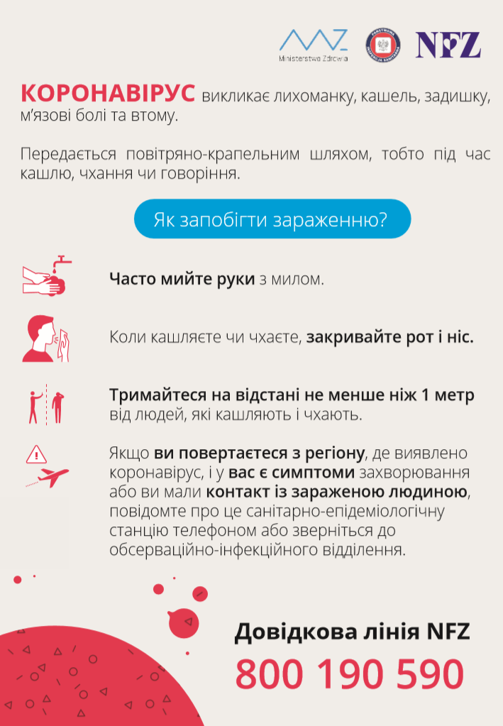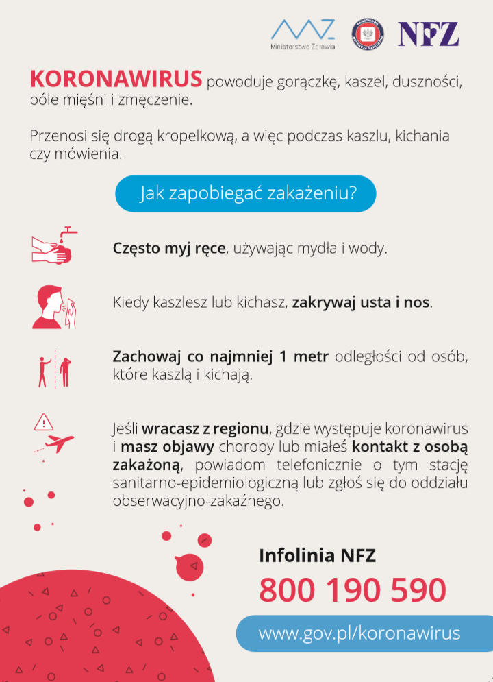 Apelujemy o korzystanie wyłącznie ze sprawdzonych źródeł informacji o koronawirusie, które znajdziecie Państwo w serwisach instytucji publicznych, na stronach: www.gis.gov.pl, gov.pl/koronawirus i dzwoniąc pod numer bezpłatnej infolinii NFZ 800-190-590.