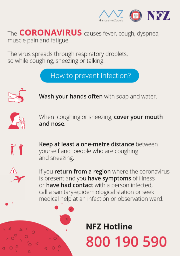 Zapoznaj się z wytycznymi Głównego Inspektora Sanitarnego w związku z występowaniem koronawirusa w Polsce. W związku z sytuacją występowania koronawirusa w Polsce, w trosce o wspólne bezpieczeństwo zdrowotne, apelujemy o przestrzegania zaleceń Państwowej Inspekcji Sanitarnej i stosowania się do wytycznych służb sanitarnych w zakresie kwarantanny i zasad higieny.