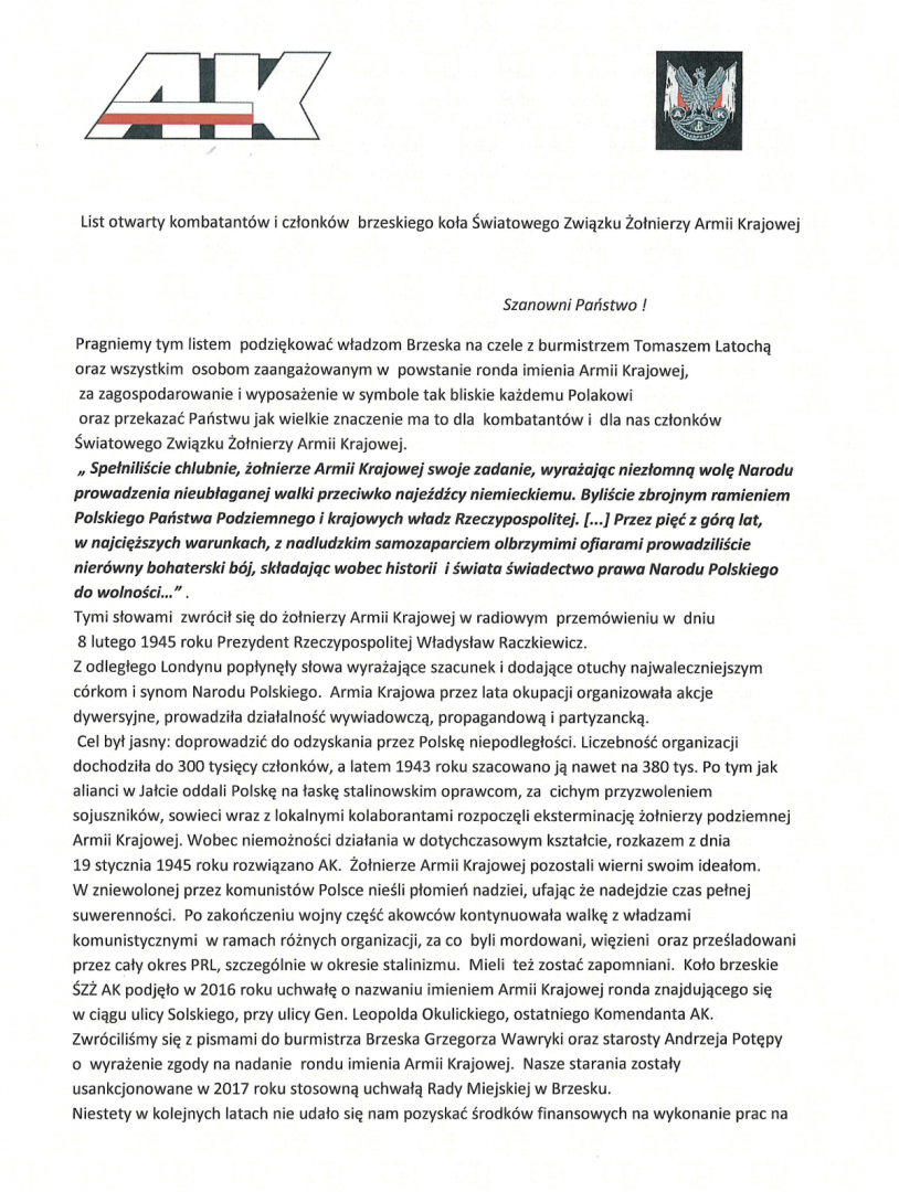 Pragniemy tym listem podziękować władzom Brzeska na czele z burmistrzem Tomaszem Latochą oraz wszystkim osobom zaangażowanym w powstanie ronda imienia Armii Krajowej, za zagospodarowanie i wyposażenie w symbole tak bliskie każdemu Polakowi oraz przekazać Państwu jak wielkie znaczenie ma to dla kombatantów i dla nas członków Światowego Związku Żołnierzy Armii Krajowej.