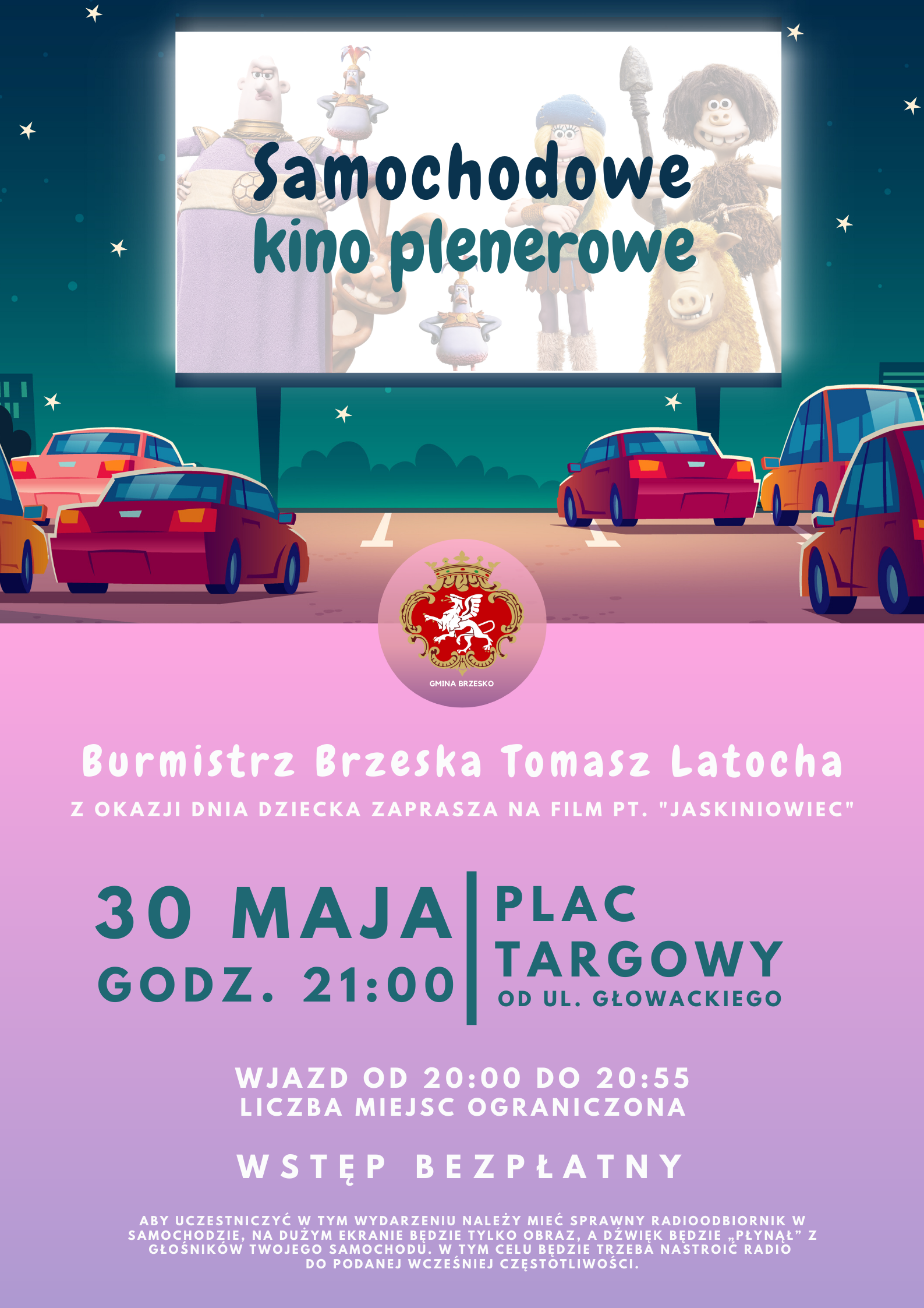 Burmistrz Brzeska Tomasz Latocha serdecznie zaprasza mieszkańców do udziału w plenerowym kinie, na który należy przyjechać własnym samochodem. Projekcję filmu planujemy na 30 maja 2020 r. tj. sobota od godziny 21.00 na parkingu Placu Targowego. Na dobry początek powrotu do „normalnego życia” w tym trudnym dla wszystkich czasie proponujemy wspaniałą animowaną komedię „JASKINIOWIEC”, na którą zapraszamy rodziców wraz z dziećmi. Kino plenerowe to jedna z form rozrywki, którą dopuszcza rozporządzenie Rady Ministrów z 16 maja 2020 r., dlatego nasze działania poszły w tym kierunku, aby naszym mieszkańcom zapewnić tę formę rozrywki. Aby uczestniczyć w wydarzeniu należy mieć sprawny radioodbiornik w samochodzie, ponieważ na dużym ekranie będzie tylko obraz, a dźwięk będzie „płynął” z głośników Twojego samochodu. W tym celu będzie trzeba nastroić radio do podanej wcześniej częstotliwości.