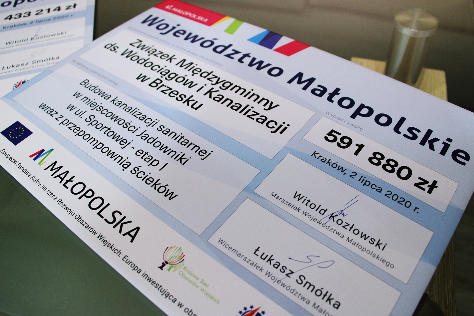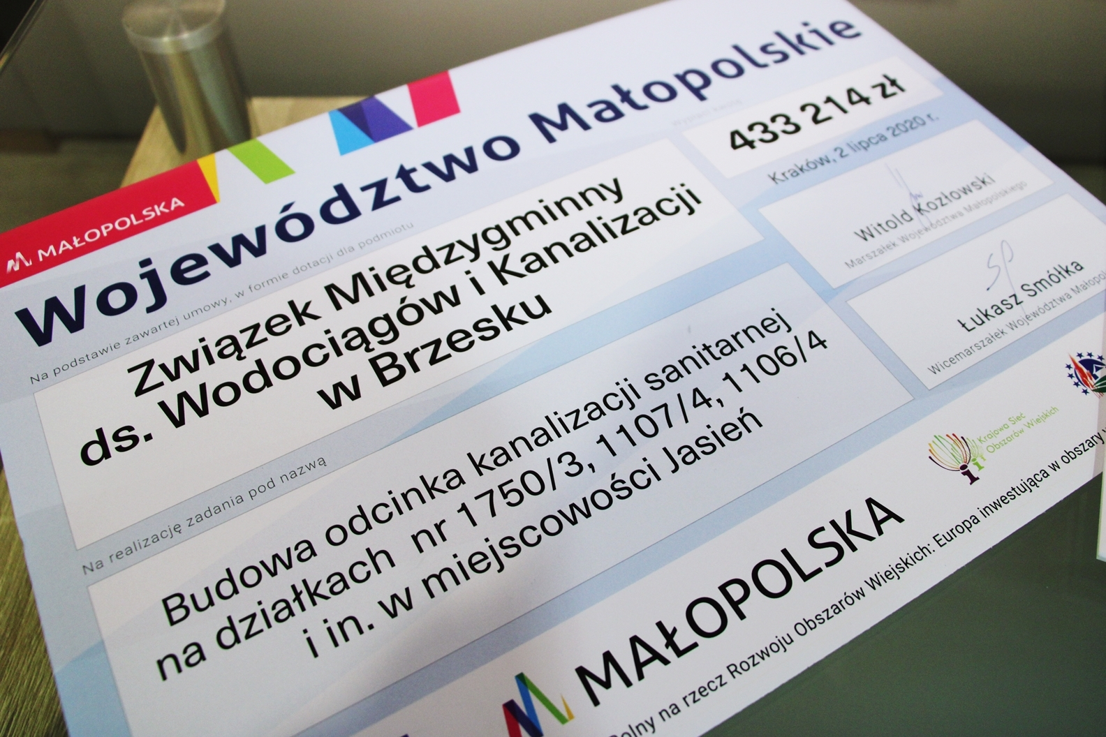Związek Międzygminny ds. Wodociągów i Kanalizacji w Brzesku otrzymał unijne dofinansowanie na dwa zadania związane z budową kanalizacji sanitarnej w Jadownikach i Jasieniu. W obu przypadkach dotacja stanowi około połowę planowanych kosztów tych inwestycji. Burmistrz Brzeska odebrał od Marszałka Województwa Małopolskiego promesy na pomoc finansową dla obu zadań.