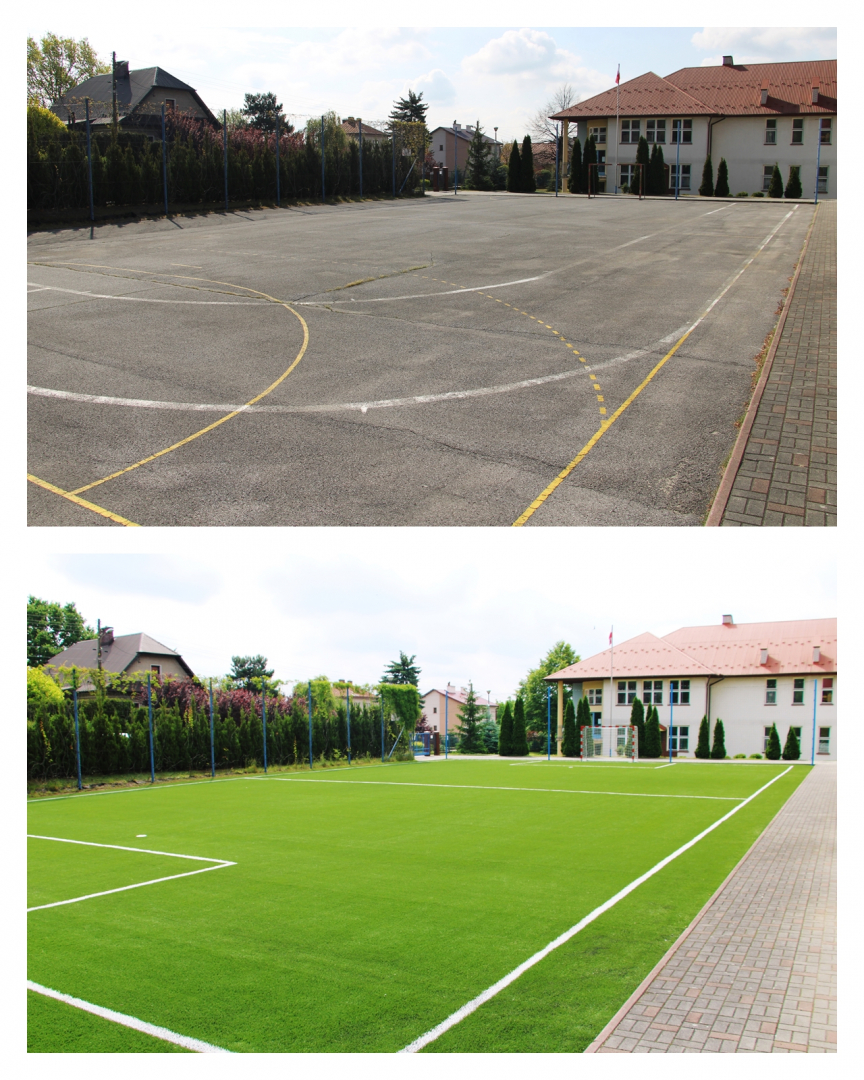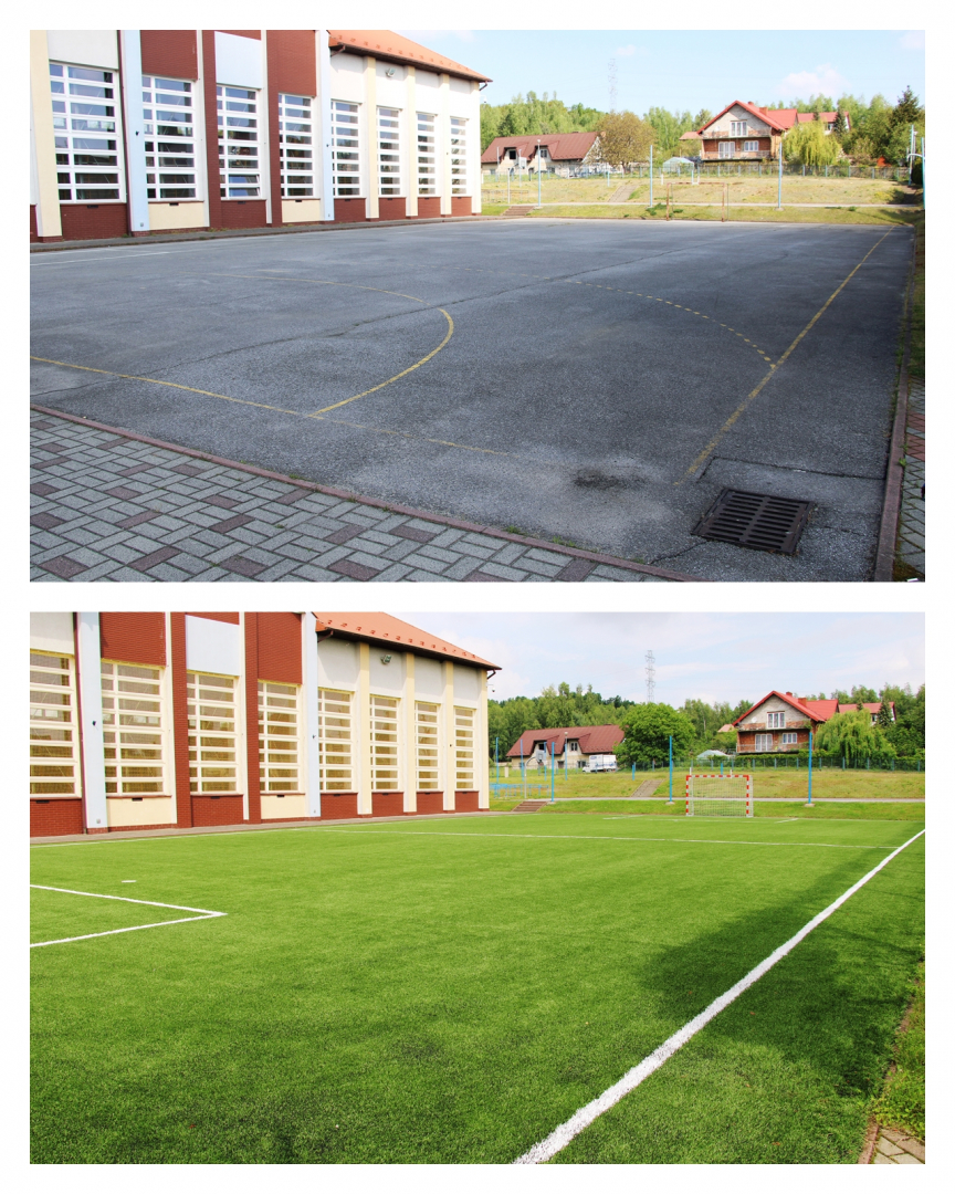 Zdjęcia przed i po wykonaniu prac na bosiku sportowym w Jadownikach.