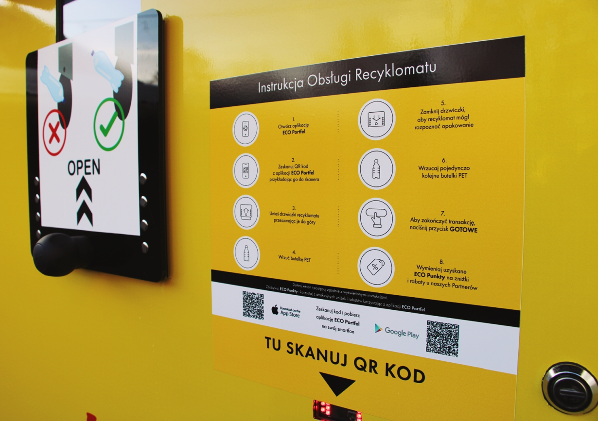 Do recyklomatów wrzuca się niezgniecione plastikowe i szklane butelki po napojach oraz aluminiowe puszki.