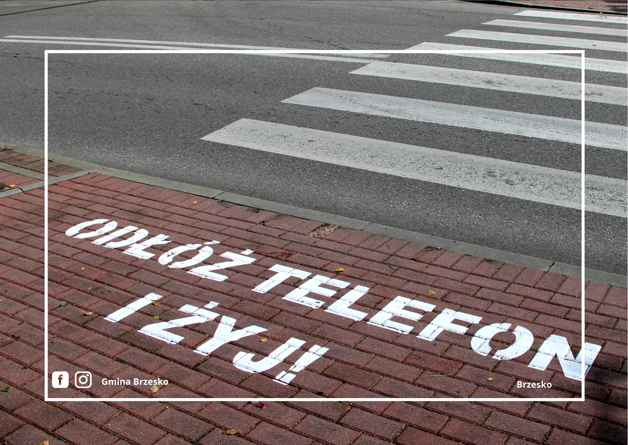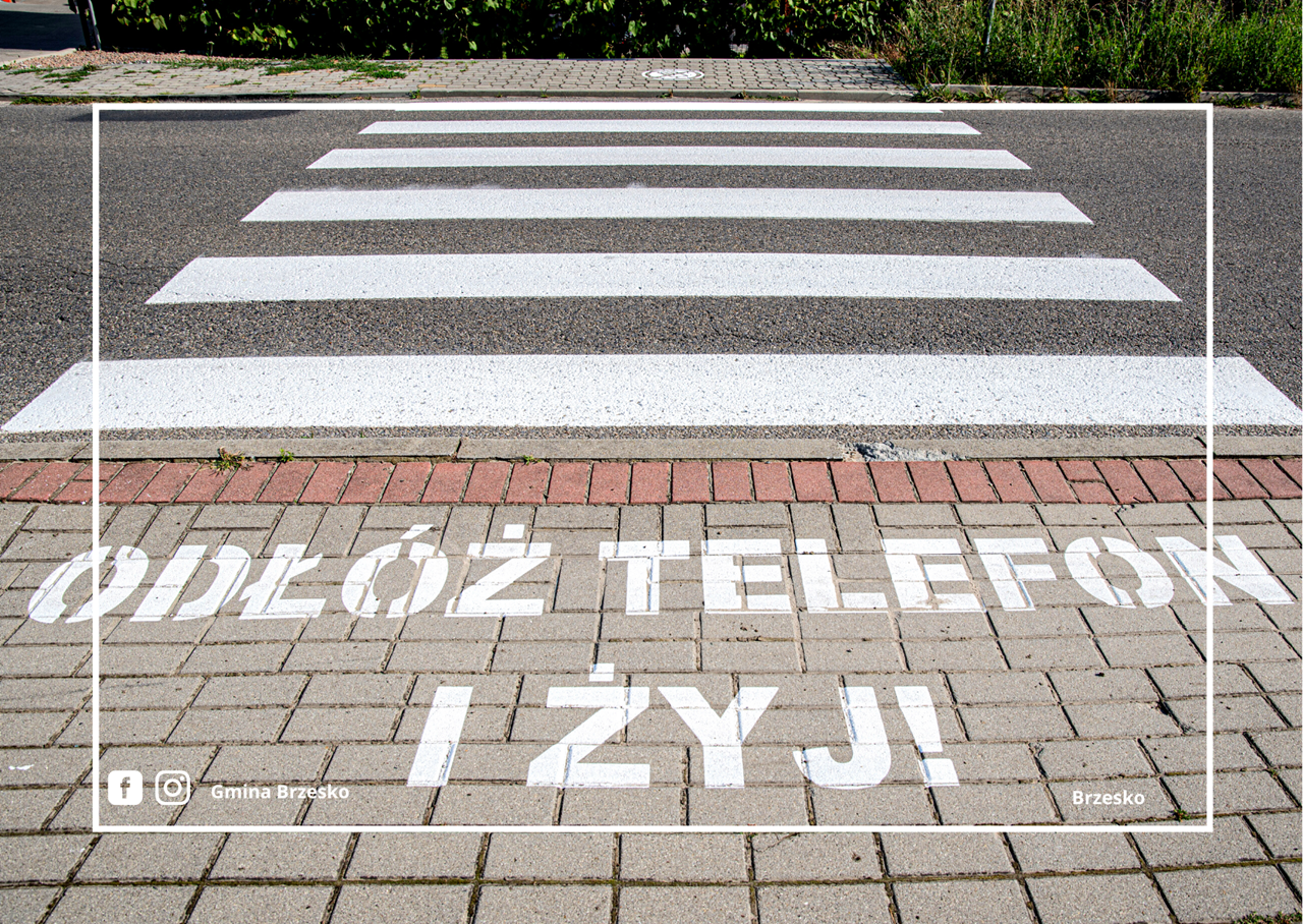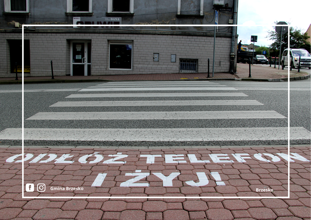 Napisy „Odłóż telefon i żyj” malowane są w Brzesku. Jak mówi Grzegorz Brach, zastępca burmistrza, termin działań nie jest przypadkowy – wszystkie napisy pojawią się przed rozpoczęciem roku szkolnego, kiedy znacznie wzrośnie ruch pieszych. Pomysłodawcą jest burmistrz Brzeska, Tomasz Latocha. We współpracy z Komendą Powiatową Policji wybrano jedenaście przejść dla pieszych w najbardziej uczęszczanych punktach miasta – czytamy we „Wspólnocie”.
