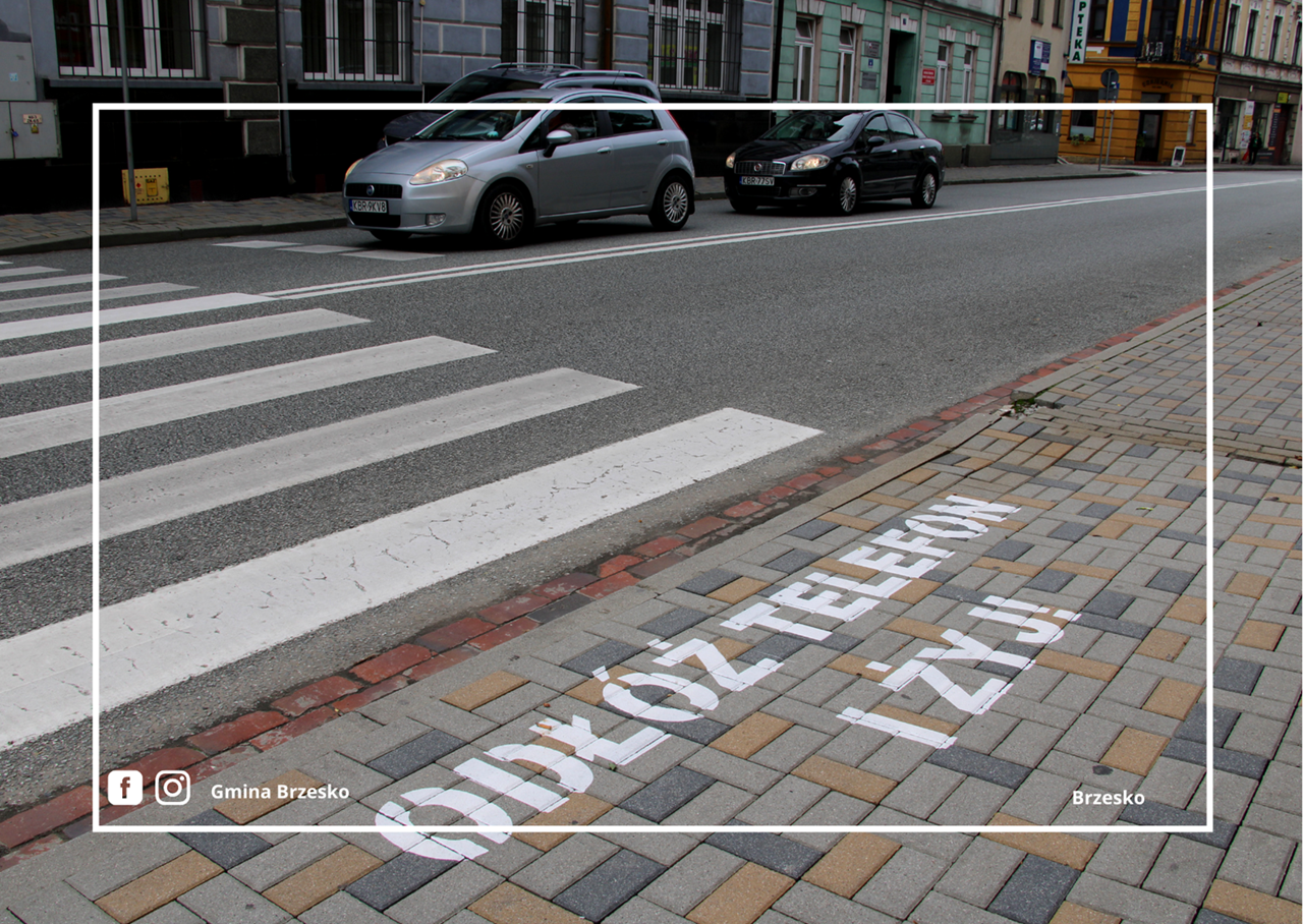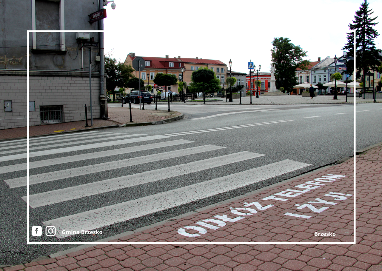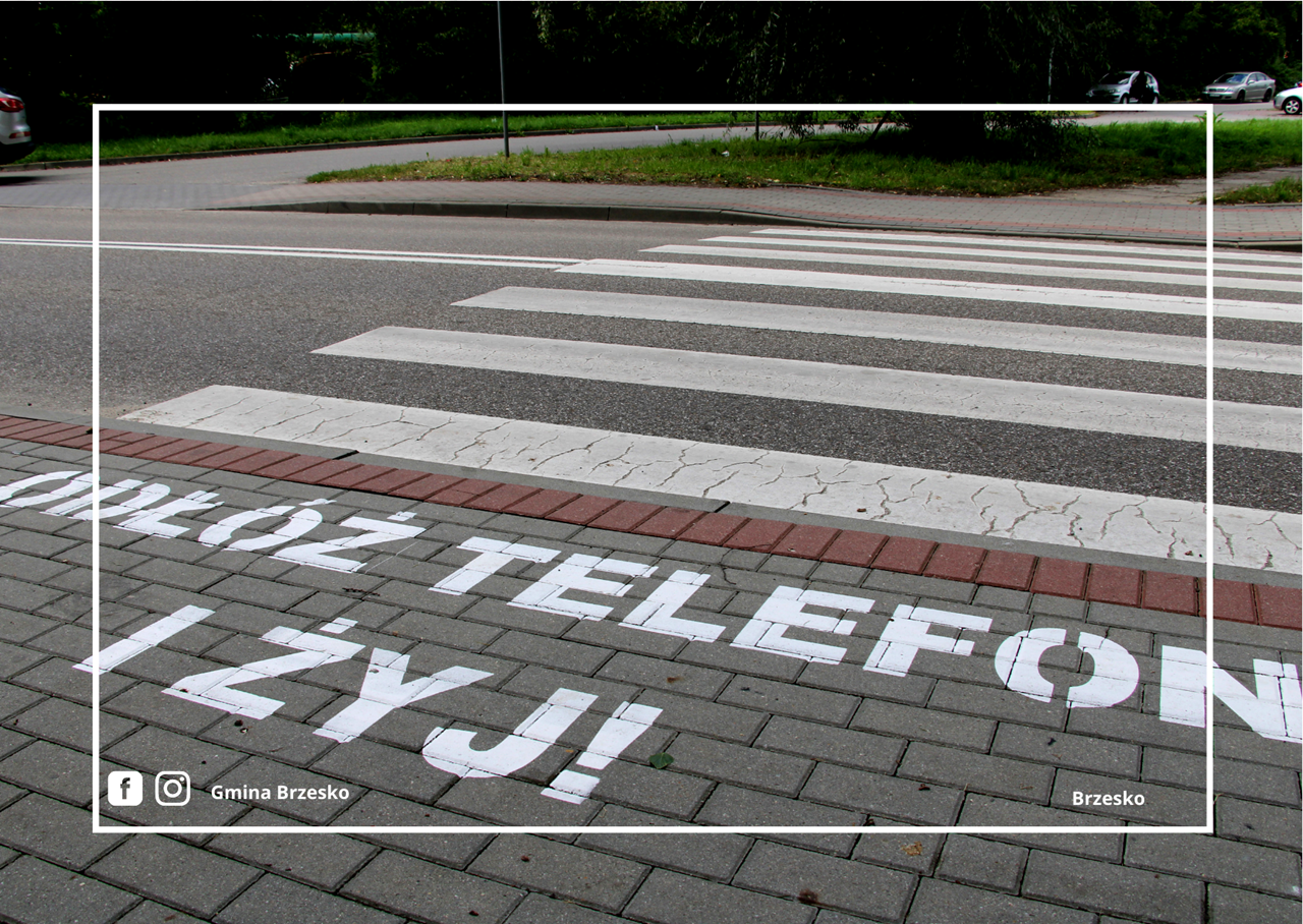 Napisy „Odłóż telefon i żyj” malowane są w Brzesku. Jak mówi Grzegorz Brach, zastępca burmistrza, termin działań nie jest przypadkowy – wszystkie napisy pojawią się przed rozpoczęciem roku szkolnego, kiedy znacznie wzrośnie ruch pieszych. Pomysłodawcą jest burmistrz Brzeska, Tomasz Latocha. We współpracy z Komendą Powiatową Policji wybrano jedenaście przejść dla pieszych w najbardziej uczęszczanych punktach miasta – czytamy we „Wspólnocie”.