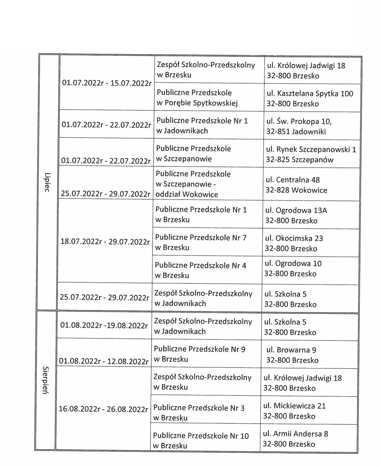 Poniżej przedstawiamy harmonogram funkcjonowania przedszkoli publicznych w gminie Brzesko w okresie od 1 lipca 2022 r. do 26 sierpnia 2022 r.