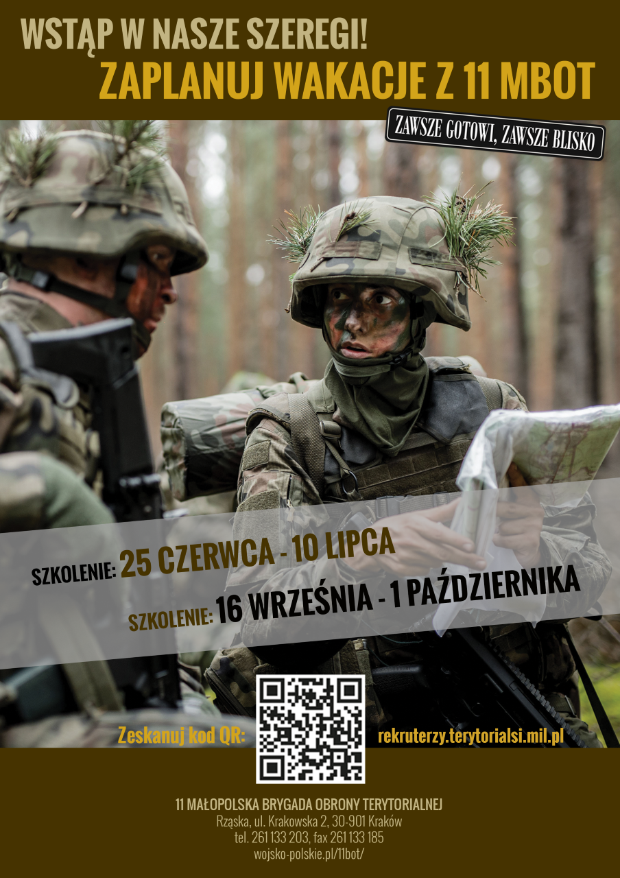 Wszystkich zainteresowanych wstąpieniem w szeregi 11 Małopolskiej Brygady Obrony Terytorialnej zachęcamy do skorzystania z pomocy dedykowanego rekrutera z właściwego terytorialnie powiatu.