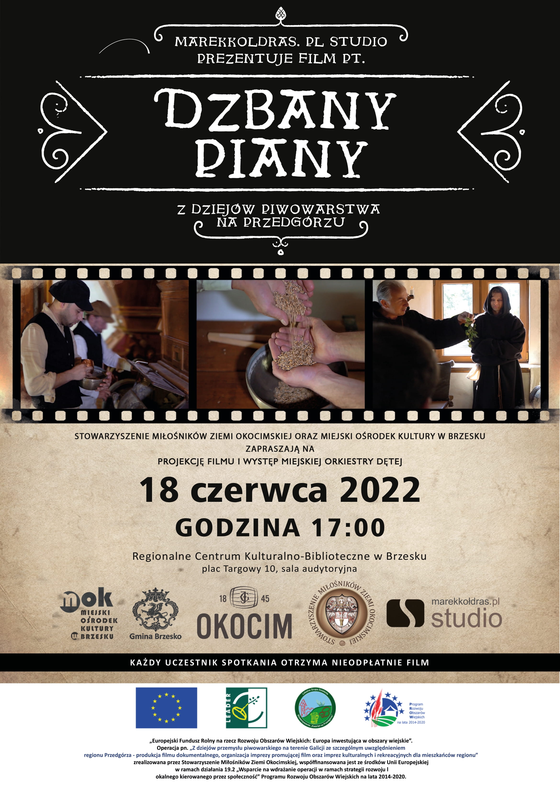 Stowarzyszenie Miłośników Ziemi Okocimskiej oraz Miejski Ośrodek Kultury w Brzesku zapraszają na premierę filmu „Dzbany Piany”, zrealizowanego przez Marka Kołdrasa, założyciela Studio.pl. Seans odbędzie się w Regionalnym Centrum Kulturalno-Bibliotecznym 18 czerwca o godz. 17:00.