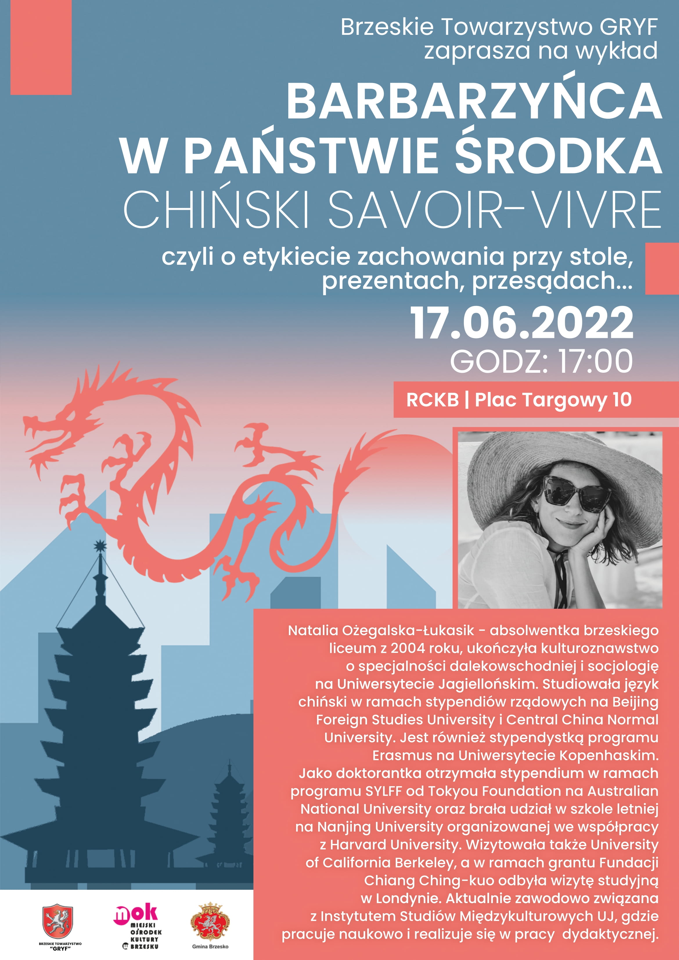 Brzeskie Towarzystwo Gryf zaprasza na wykład Natalii Ożegalskiej - Łukasik na temat chińskiej kultury. Spotkanie odbędzie się w Regionalnym Centrum Kulturalno-Bibliotecznym, w piątek 17 czerwca o godzinie 17.00.