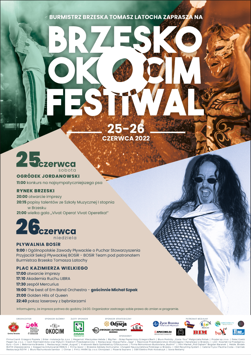 Po dwuletniej przerwie znów możemy Państwa zaprosić na BRZESKO-OKOCIM FESTIWAL 2022! Największa impreza Gminy Brzesko powraca! Mamy dla Was 2 DNI fantastycznej zabawy! Operetka, orkiestra, rockowe klasyki, gwiazdy muzyki pop, bębny, lasery – to wszystko w Brzesku w dniach 25-26 CZERWCA. Szczegóły na plakacie.