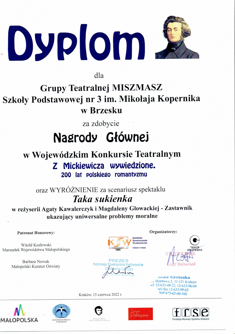 Opiekunowie Koła Teatralnego MISZMASZ serdecznie dziękują Dyrekcji Miejskiego Ośrodka Kultury w Brzesku za umożliwienie nagrania spektaklu konkursowego na scenie w Regionalnym Centrum Kulturalno–Bibliotecznym.