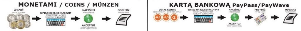 Jednocześnie informujemy, że na każdym parkomacie (na ścianie frontowej) znajduje się powyższa instrukcja w formie graficznej, dodatkowo przy zakupie biletu parkingowego w parkomacie na wyświetlaczu pojawiają się komunikaty wskazujące czynności jakie należy wykonać.