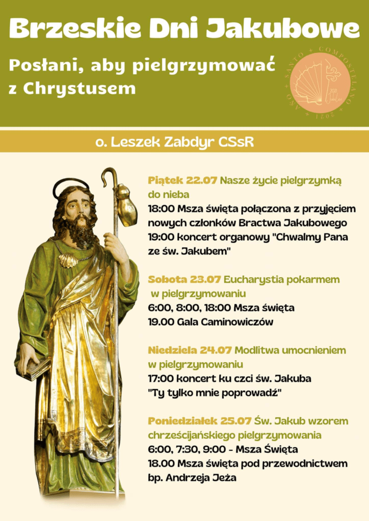 Ksiądz Prałat Józef Drabik, proboszcz parafii NMP Matki Kościoła i św. Jakuba Apostoła, a zarazem kustosz Sanktuarium Św. Jakuba Starszego Apostoła przy Drodze „Via Regia” oraz burmistrz Brzeska Tomasz Latocha serdecznie zapraszają do udziału w tegorocznych Brzeskich Dniach Jakubowych, które odbędą się od 22 do 25 lipca, a przyświecać im będzie hasło „Posłani, aby pielgrzymować z Chrystusem”. Szczegółowe informacje zawarte są na plakatach.