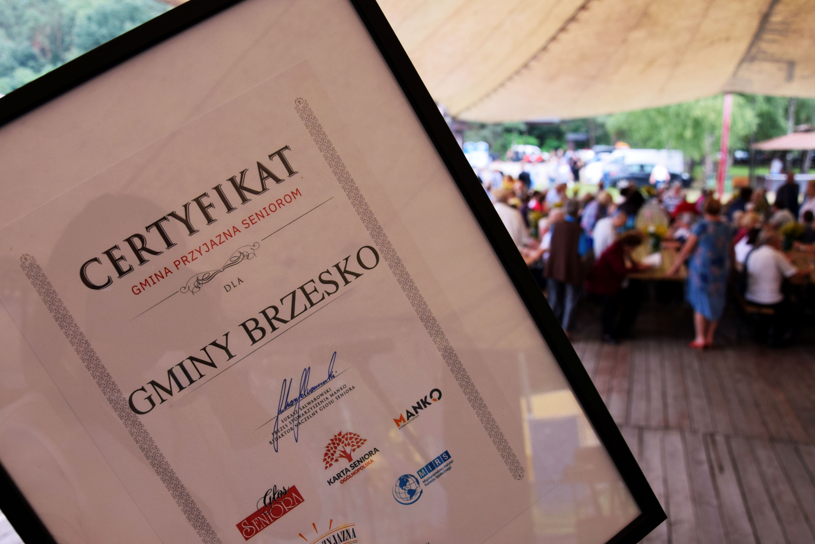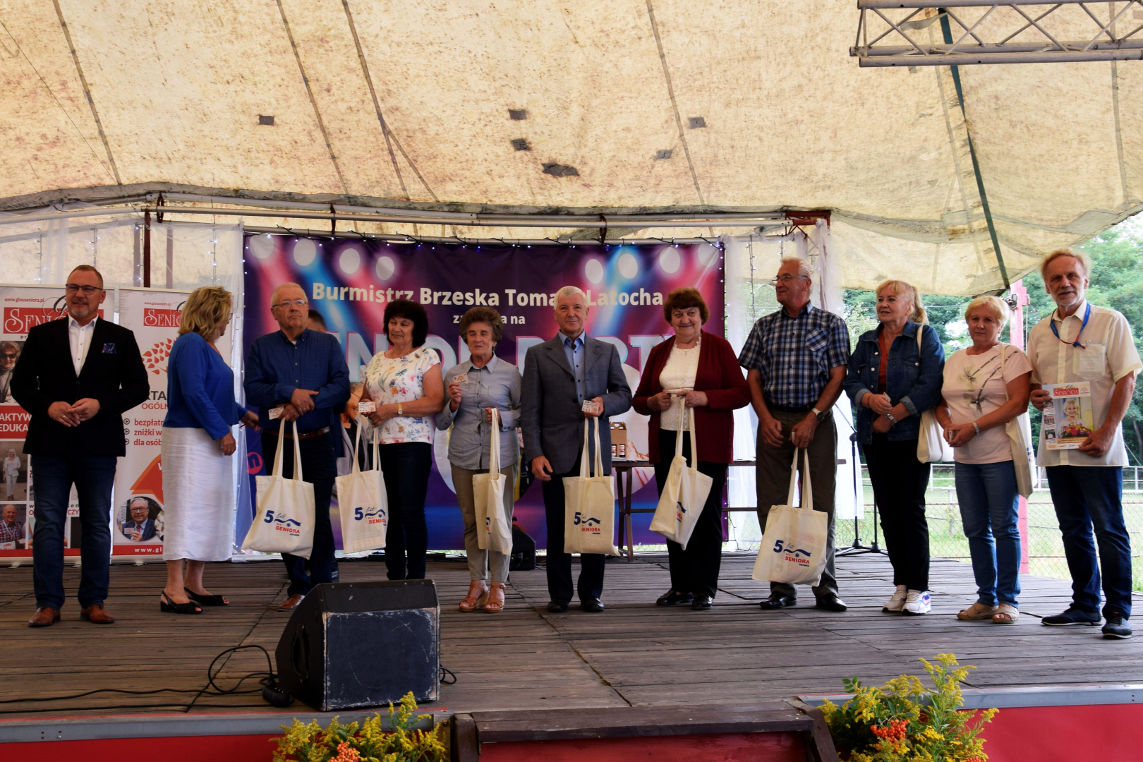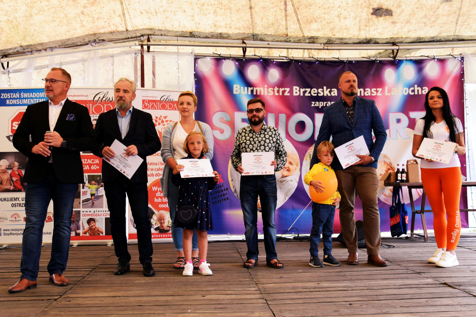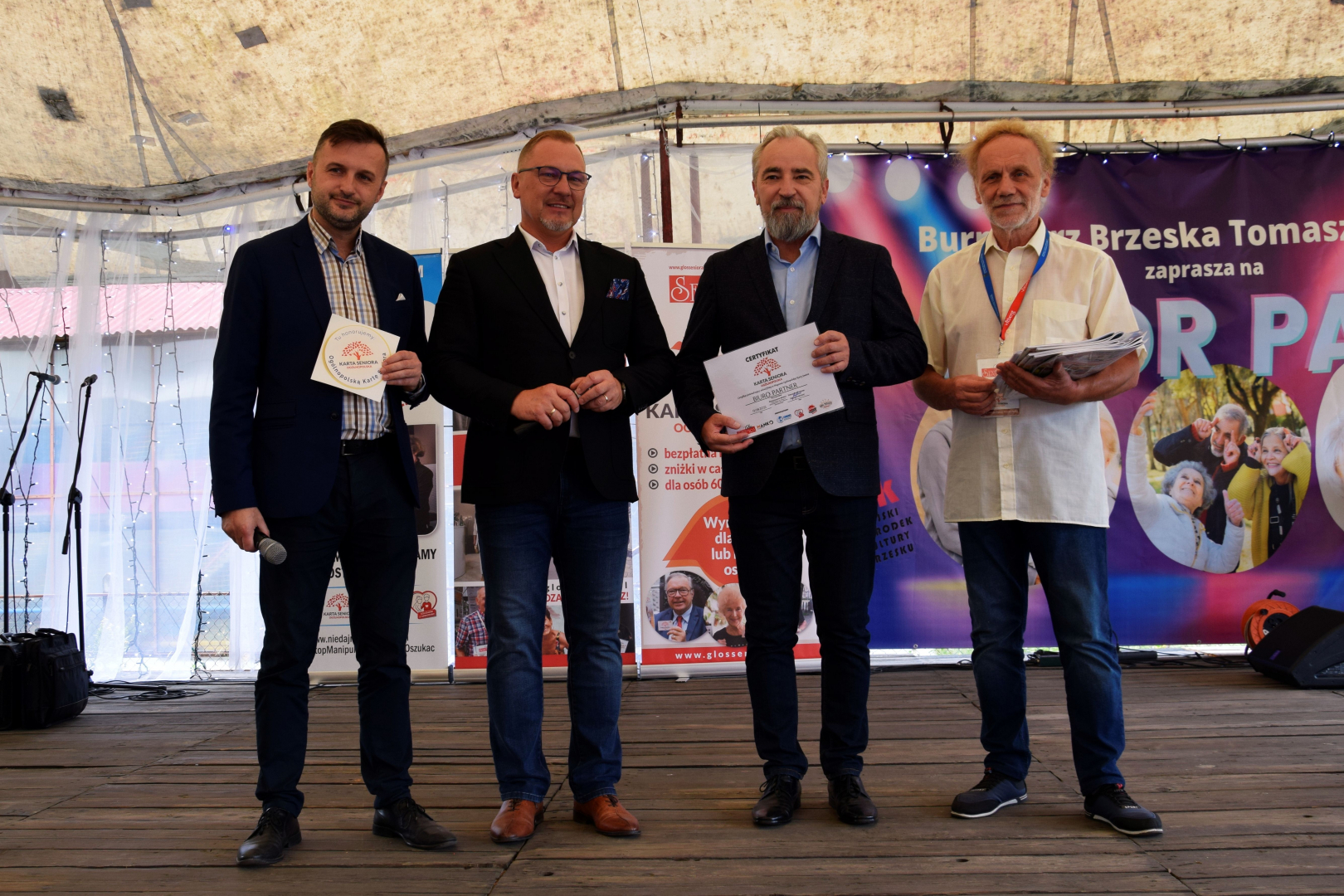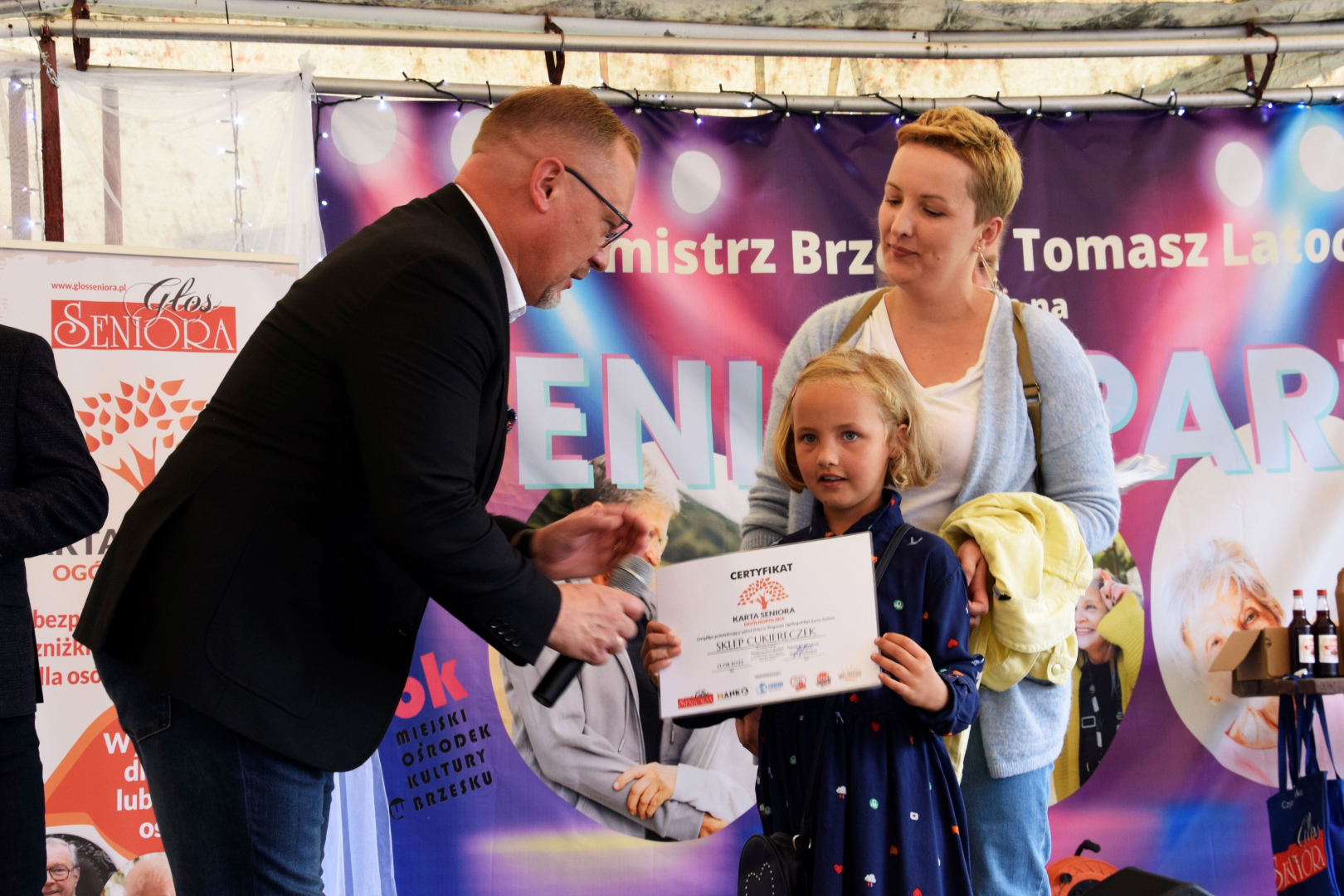 Pierwszą część Senior Party poprowadzili sygnatariusze porozumienia dotyczącego programu „Gmina Przyjazna Seniorom” – prezes Stowarzyszenia MANKO Łukasz Salwarowski oraz burmistrz Brzeska Tomasz Latocha, który na wstępie otrzymał z rąk prezesa certyfikat potwierdzający przystąpienie naszej gminy do projektu. Pierwsze osiem Ogólnopolskich Kart Seniora zostało oficjalnie wręczonych na piknikowej scenie. Kolejne OKS rozdawane były przez cały czas trwania imprezy – w sumie wydano ich około 450. Prezes MANKO oraz burmistrz wręczyli także certyfikaty potwierdzające przystąpienie do programu przez pierwsze brzeskie przedsiębiorstwa.