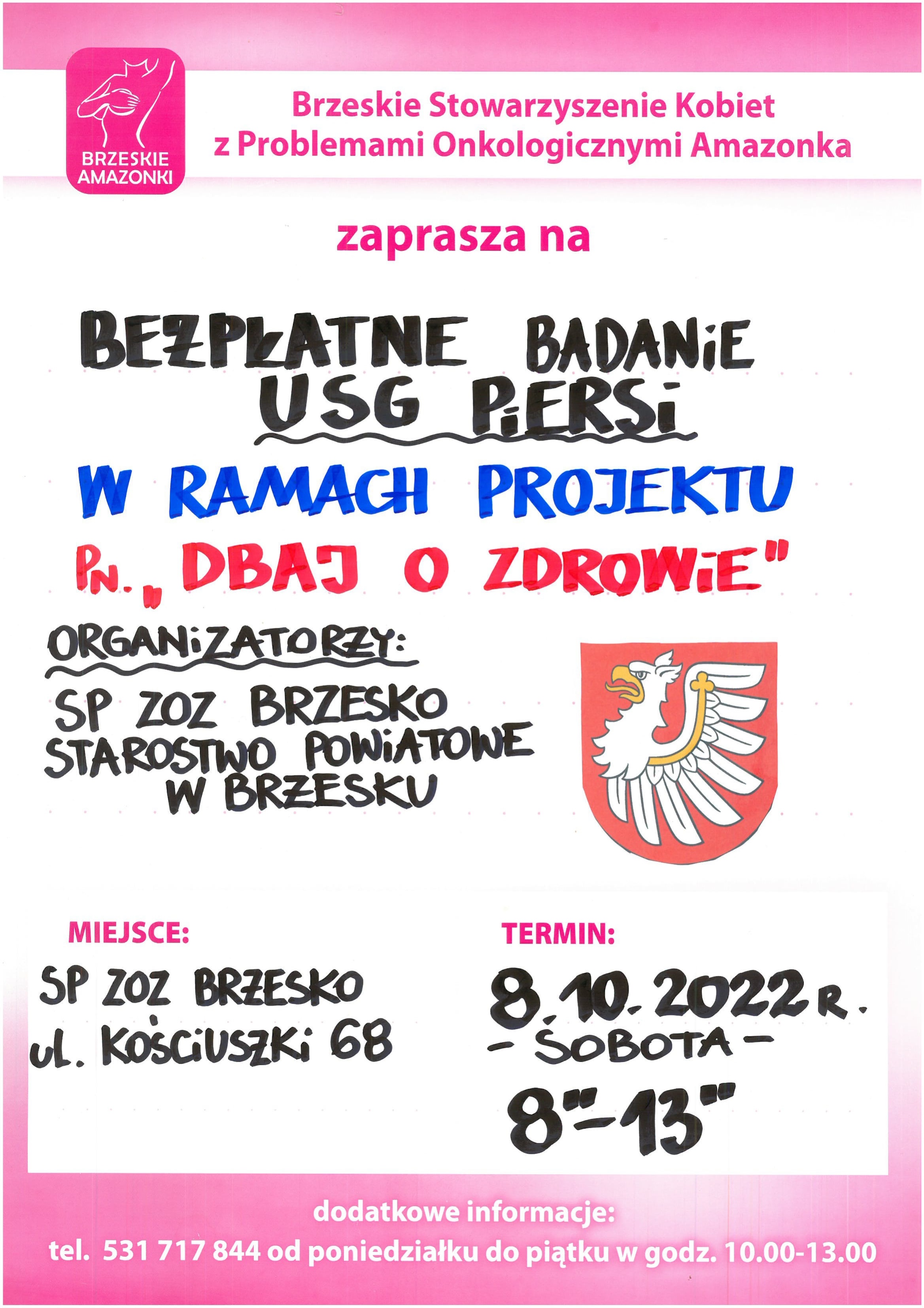Brzeskie Stowarzyszenie Kobiet z Problemami Onkologicznymi AMAZONKA zaprasza na bezpłatne badanie USG piersi. Szczegóły na plakacie.