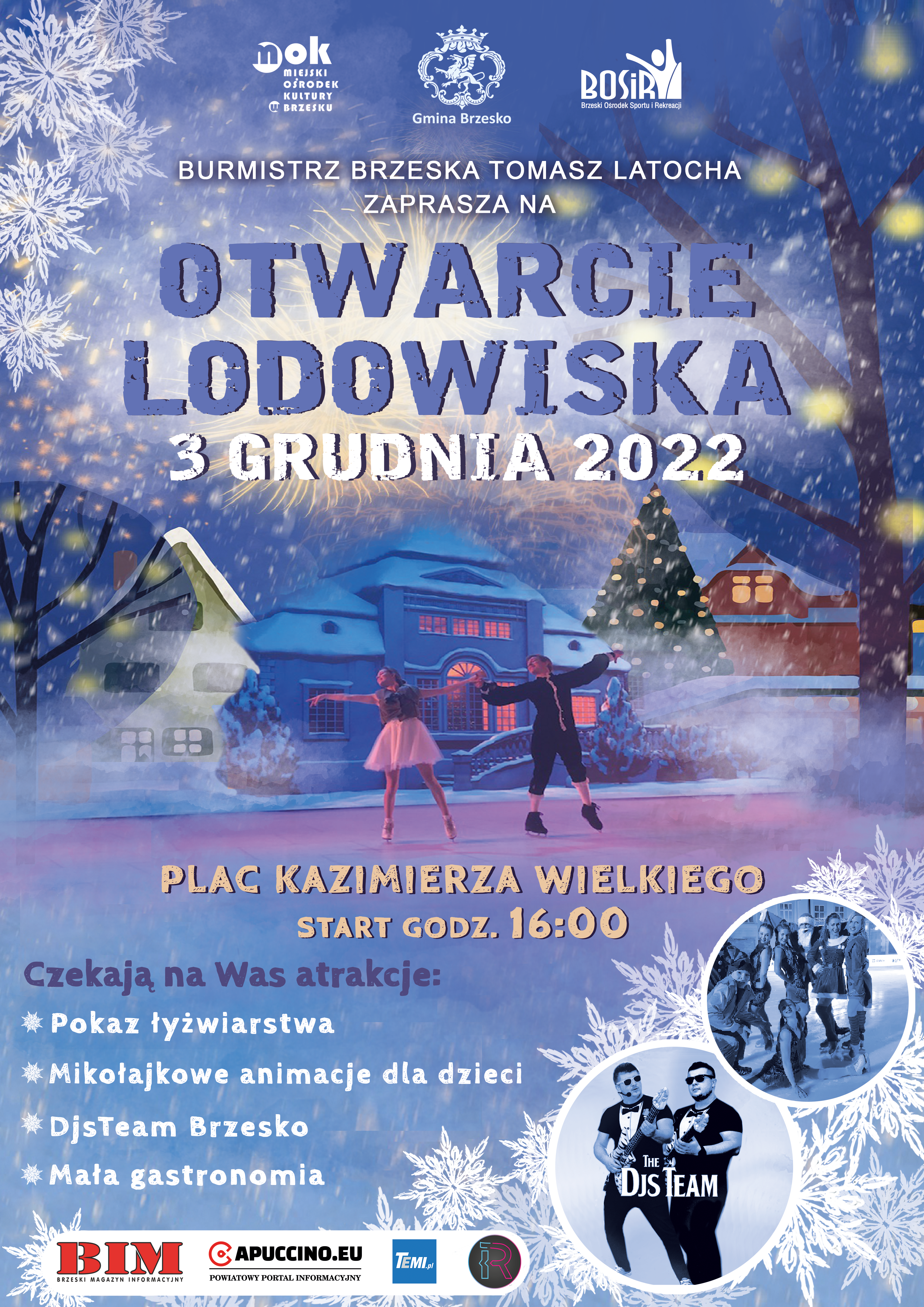 Burmistrz Brzeska Tomasz Latocha, Brzeski Ośrodek Sportu i Rekreacji oraz Miejski Ośrodek Kultury zapraszają na plac Kazimierza Wielkiego, gdzie 3 grudnia o godz. 16:00 odbędzie się wielkie otwarcie sztucznego lodowiska.