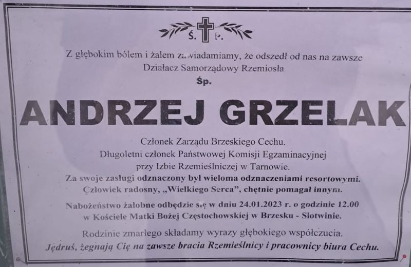 Z głębokim żalem przyjęliśmy wiadomość, że w wieku 63 lat zmarł Andrzej Grzelak, długoletni członek Zarządu Cechu Rzemieślników, Małych i Średnich Przedsiębiorców w Brzesku, znany i szanowany obywatel gminy Brzesko. W rzemieślniczym środowisku ceniony za fachowość, jako mistrz w zawodach budowlanych był wieloletnim członkiem Państwowej Komisji Egzaminacyjnej przy Izbie Rzemieślniczej w Tarnowie. Za swoje zasługi wielokrotnie nagradzany resortowymi odznaczeniami.