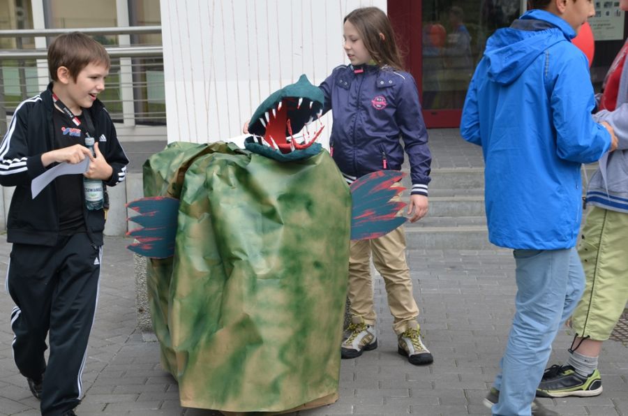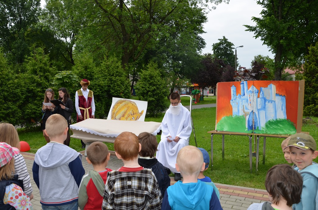 Kolorowe przebrania i scenografia, wykonana w czasie warsztatów z panią Anną Serwin, przyciągały uwagę każdego kto przechodził nieopodal. Śmiałkom, którzy zadawali pytania lub odpowiadali na zadane im zagadki wręczaliśmy balony z logo naszej biblioteki. Dodatkowo na tych, którzy odważyli się przejść coraz węższym tunelem „Poszukiwaczy skarbów” czekały słodkie nagrody. Talent aktorski uczniów był nagradzany sowicie brawami. Należy zaznaczyć, że młodzież wykazała ponadprzeciętny zapał biorąc udział w przedsięwzięciu.