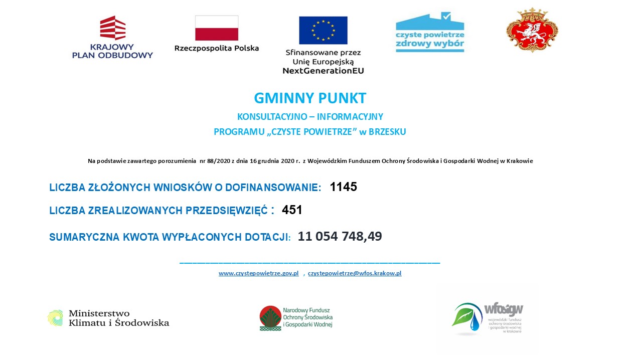 Informujemy, iż w Gminie Brzesko funkcjonuje Punkt Konsultacyjno-Informacyjny programu „Czyste Powietrze”, gdzie mogą Państwo uzyskać od Ekodoradcy informacje o programie oraz pomoc przy wypełnianiu wniosku o udzielenie dofinansowania.