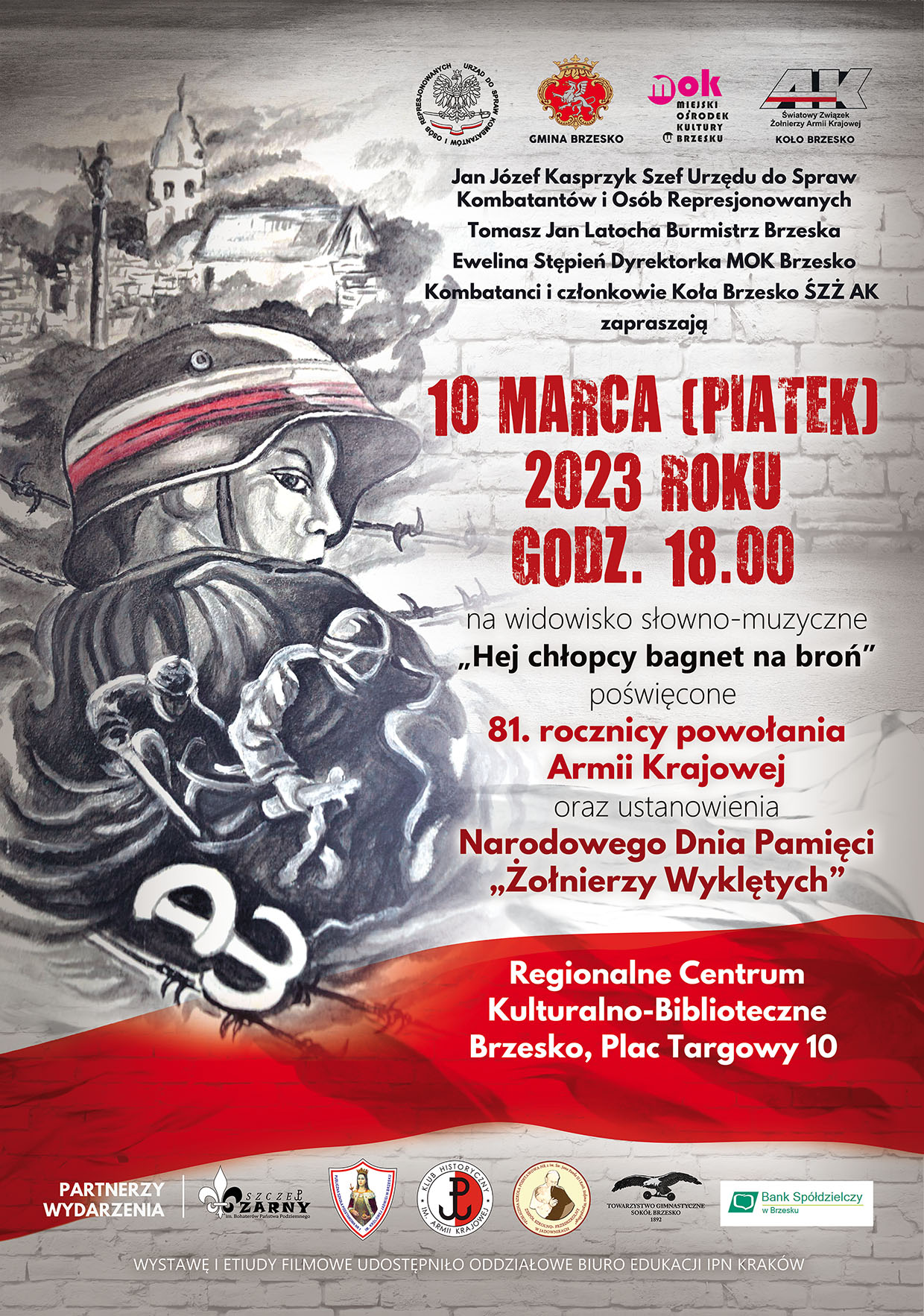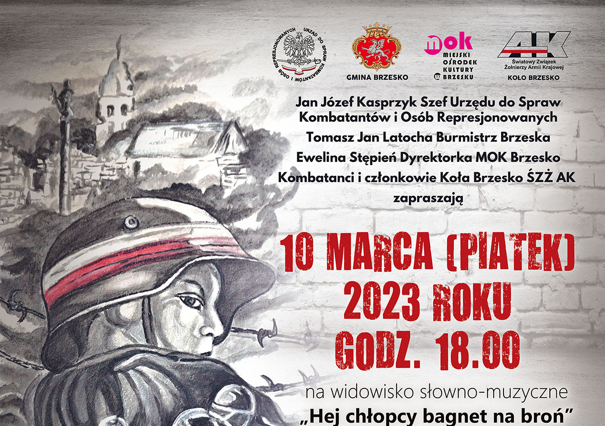 Burmistrz Brzeska Tomasz Latocha, Miejski Ośrodek Kultury oraz kombatanci i członkowie Koła Brzesko Światowego Związku Żołnierzy AK zapraszają 10 marca (godzina 18:00) do sali audytoryjnej RCK-B, w której odbędzie się widowisko słowno-muzyczne „Hej chłopcy, bagnet na broń” poświęcone 81. rocznicy powołania Armii Krajowej oraz obchodzonemu 1 marca Narodowemu Dniowi Pamięci Żołnierzy Wyklętych.