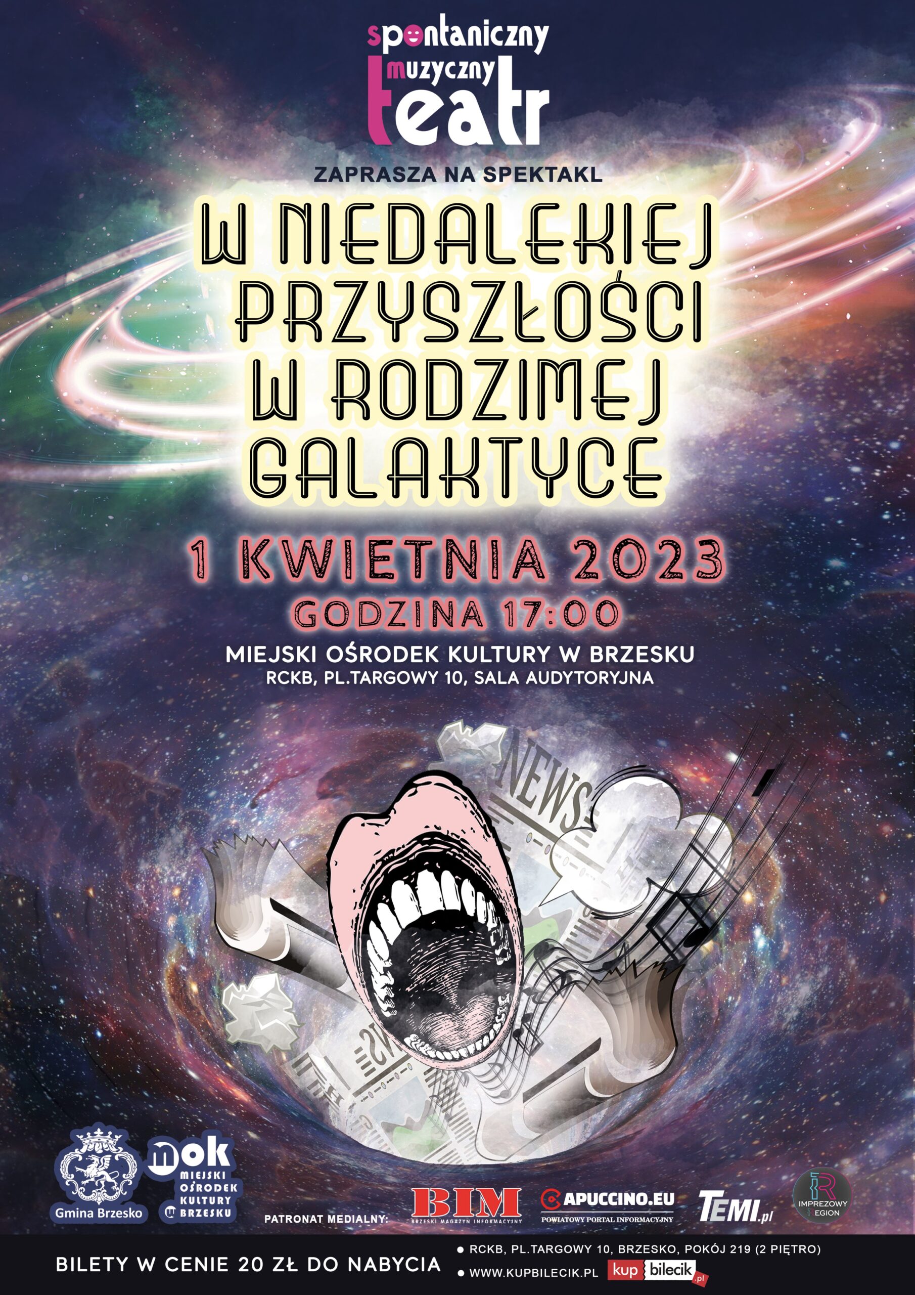Spontaniczny Teatr Muzyczny powraca z nowym projektem! W NIEDALEKIEJ PRZYSZŁOŚCI W RODZIMEJ GALAKTYCE to pierwszy od długiego czasu spektakl muzyczny w wykonaniu działającej w MOK-u grupy wokalno-aktorskiej. Zespół ma na koncie takie widowiska jak „Zakochany Złodziej”, „Draculaland”, „Księżniczka Czardasza” czy adaptacja „Strasznego Dworu” Stanisława Moniuszki.