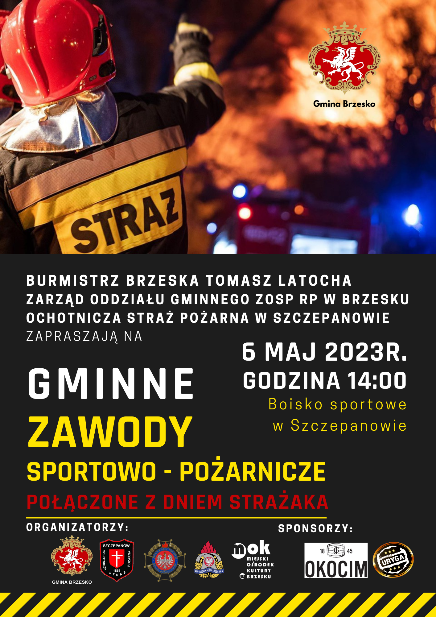 Tomasz Jan Latocha Burmistrz Brzeska, Zarząd Oddziału Gminnego ZOSP RP w Brzesku oraz OSP Szczepanów zapraszają w sobotę 6 maja 2023 roku na Gminne Zawody Sportowo-Pożarnicze, start godz. 14.00.