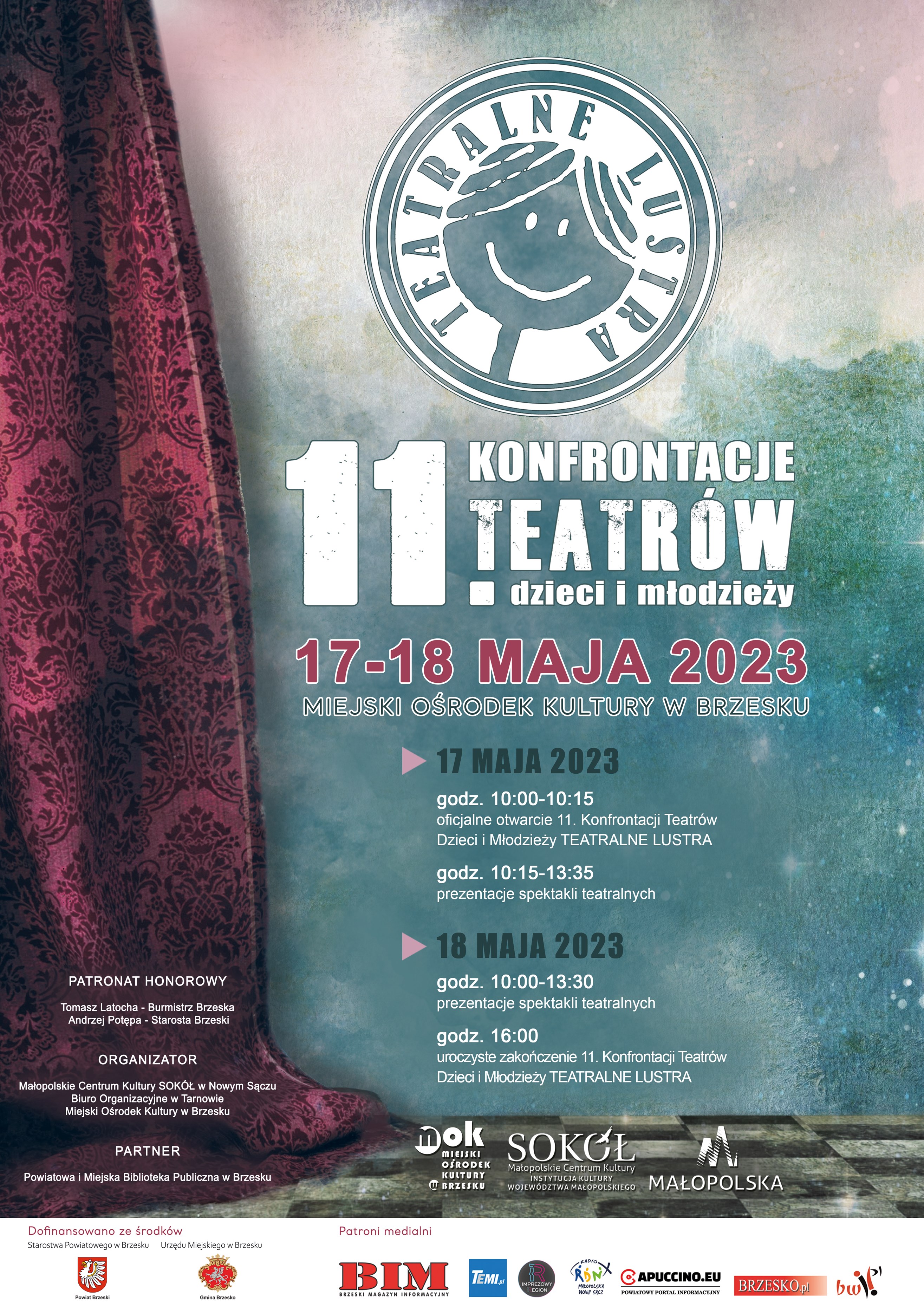 Burmistrz Brzeska Tomasz Latocha, Małopolskie Centrum Kultury SOKÓŁ oraz Miejski Ośrodek Kultury w Brzesku zapraszają na 11. Konfrontacje Teatrów Dzieci i Młodzieży TEATRALNE LUSTRA, które odbędą się 17 i 18 maja w Regionalnym Centrum Kulturalno-Bibliotecznym. Spektakle zgłoszone do konkursu będą prezentowane każdego dnia od godziny 10.00.