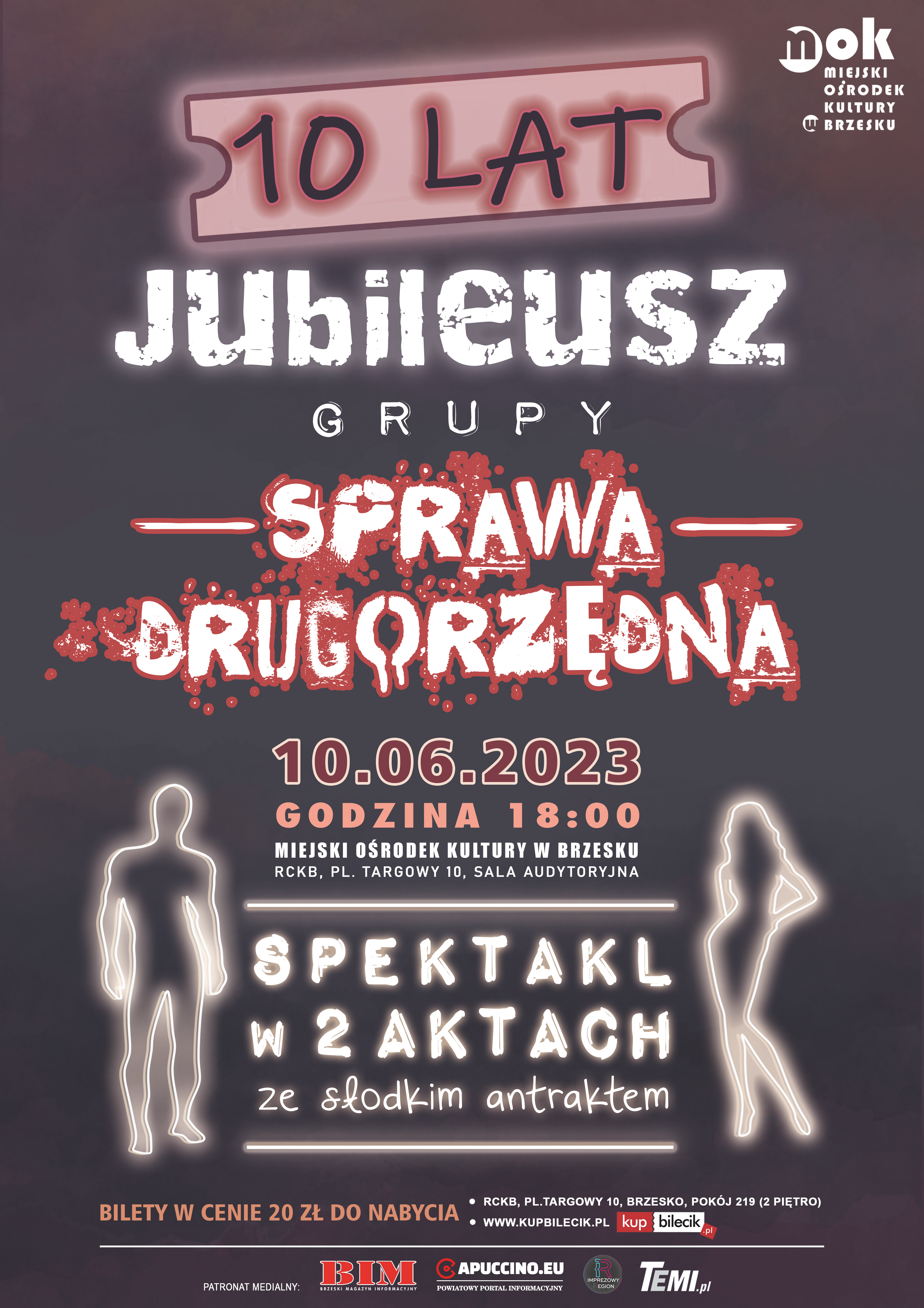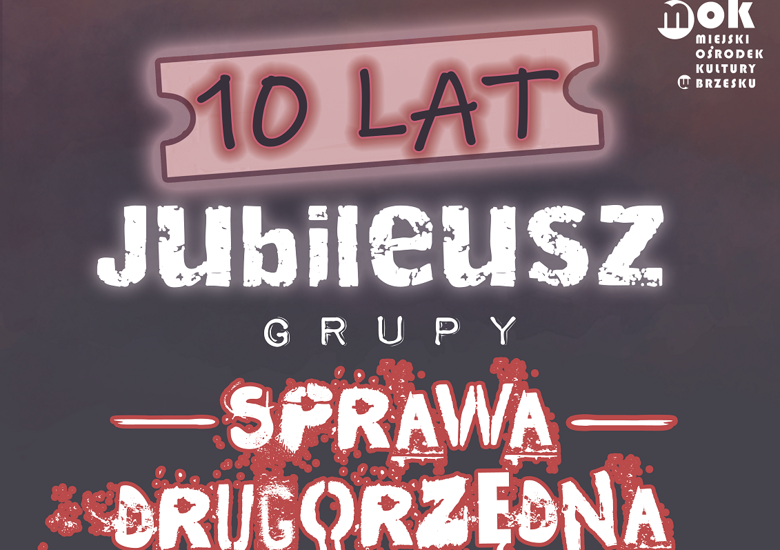 10 czerwca o godzinie 18:00 w sali widowiskowej Regionalnego Centrum Kulturalno-Bibliotecznego rozpocznie się jubileuszowy koncert grupy kabaretowej Sprawa Drugorzędna, która w tym roku obchodzi 10-lecie istnienia.