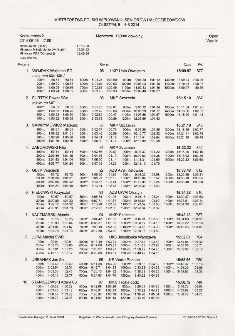 W odbywających się w Olsztynie Mistrzostwach Polski w pływaniu osiemnastoletni Wojtek stanął na najwyższym stopniu podium, zwyciężając w wyścigu na dystansie 1500 m stylem dowolnym.Wielokrotny Mistrz Polski, medalista Mistrzostw Europy, członek Kadry Narodowej Polski juniorów, wychowanek Brzeskiego Ośrodka Sportu i Rekreacji w Brzesku, a obecnie reprezentujący Szkołę Mistrzostwa Sportowego w Oświęcimiu nie dał szans swoim rywalom w pierwszym swoim starcie w gronie seniorów.Złoty medal zdobył w wielkim stylu osiągając fantastyczny czas 15:09,97, dający mu trzecią lokatę w klasyfikacji wszechczasów w tej konkurencji w naszym kraju. Wynik złotego medalisty daje mu na dzień dzisiejszy 9. miejsce w Europie i pewną kwalifikację na sierpniowe Mistrzostwa Europy w Berlinie.Kolejne szanse na zdobycie medali będą w następnych dniach, podczas wyścigów na dystansach 400 i 800 metrów stylem dowolnym.Przypomnijmy, że w dniu 26 marca na XLVII Sesji Rady Miejskiej w Brzesku podziękowano Panu Wojtkowi za reprezentowanie naszego miasta na arenach światowych, oraz za osiągnięte wyniki, a następnych sukcesów w imieniu władz samorządowych życzył burmistrz Grzegorz Wawryka.