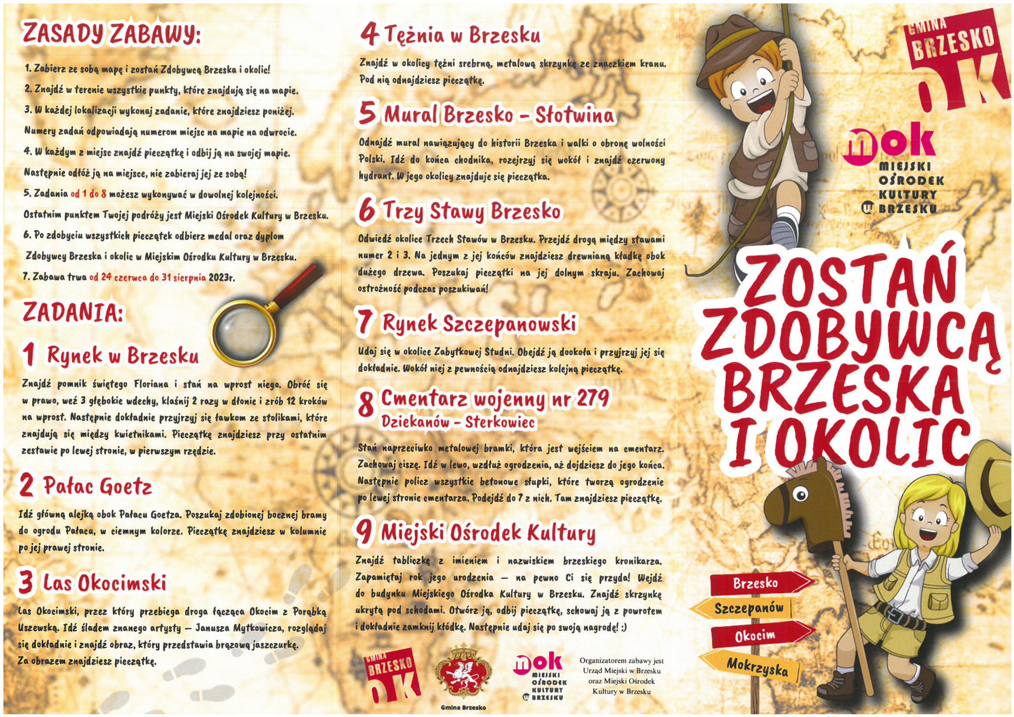 Dla wszystkich dzieci, miejscowych i przyjezdnych, które podczas tegorocznych wakacji przynajmniej przez jakiś czas będą przebywać na terenie gminy Brzesko, Urząd Miejski w Brzesku oraz Miejski Ośrodek Kultury przygotowali grę terenową „Zostań zdobywcą Brzeska i okolic”. Zabawa potrwa do 31 sierpnia br.