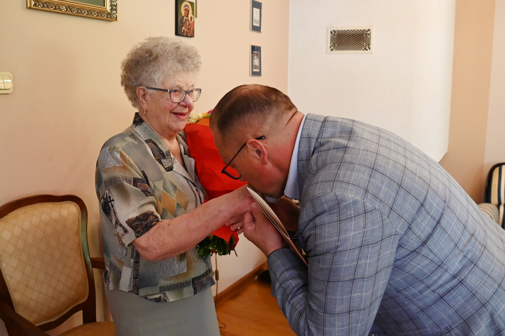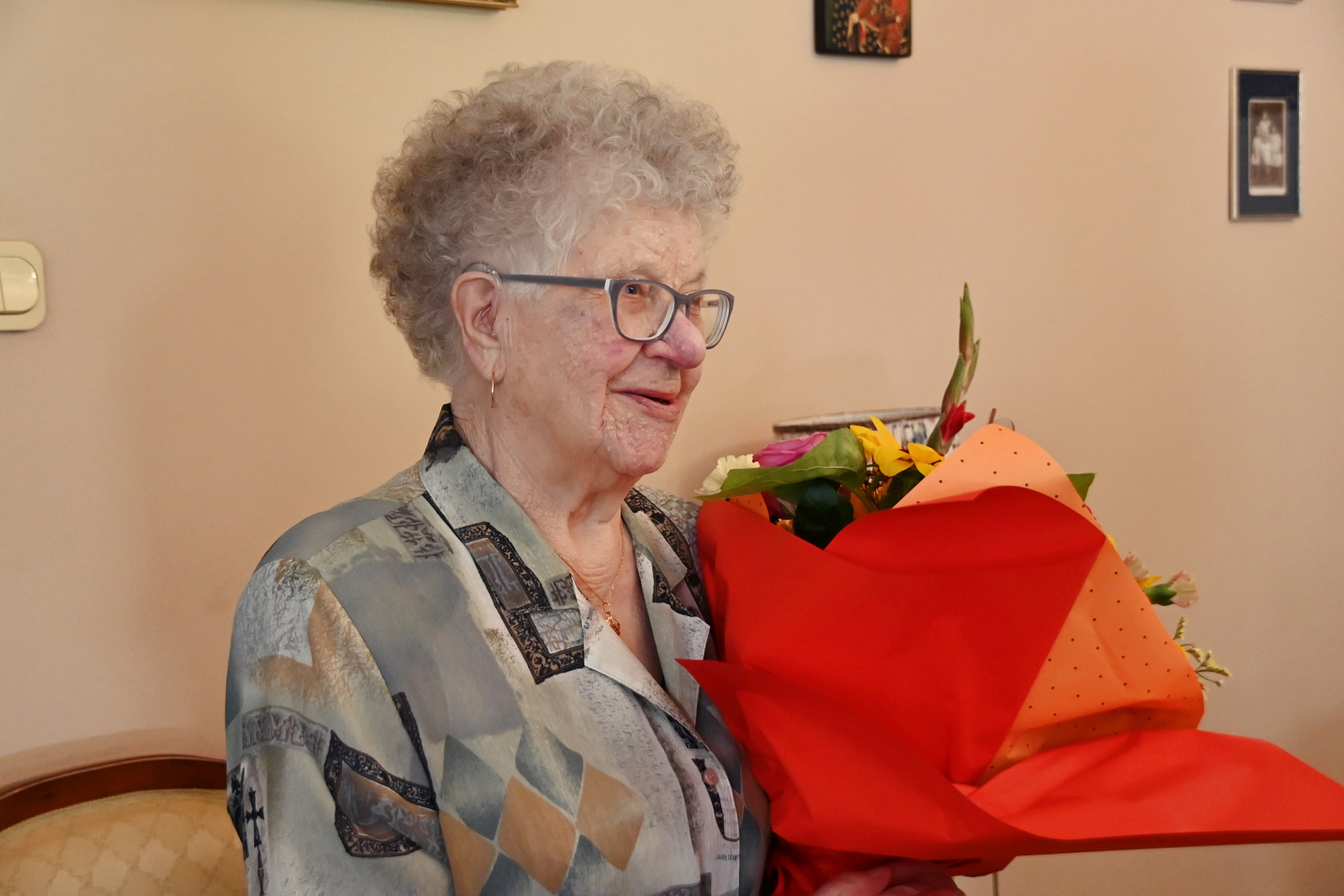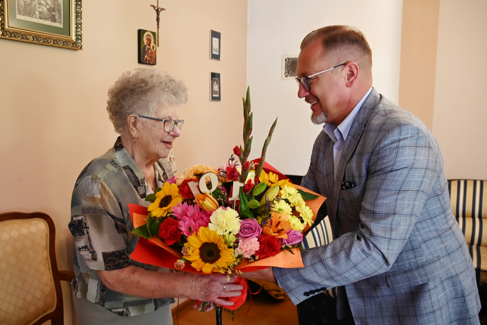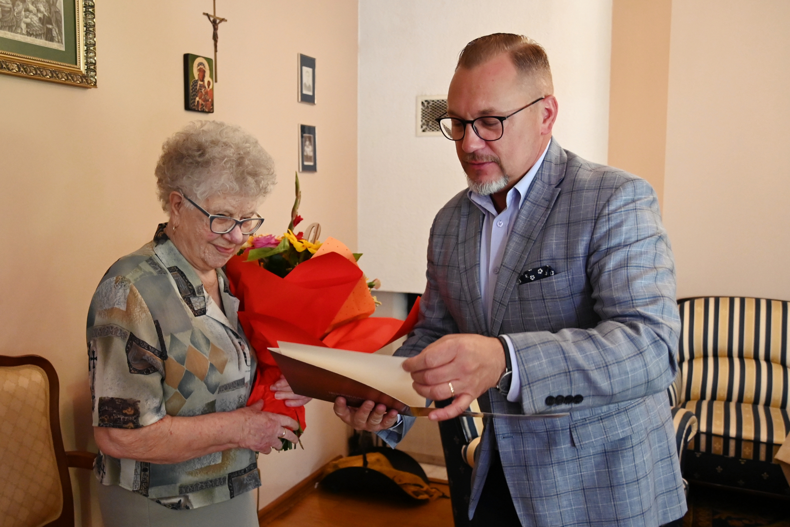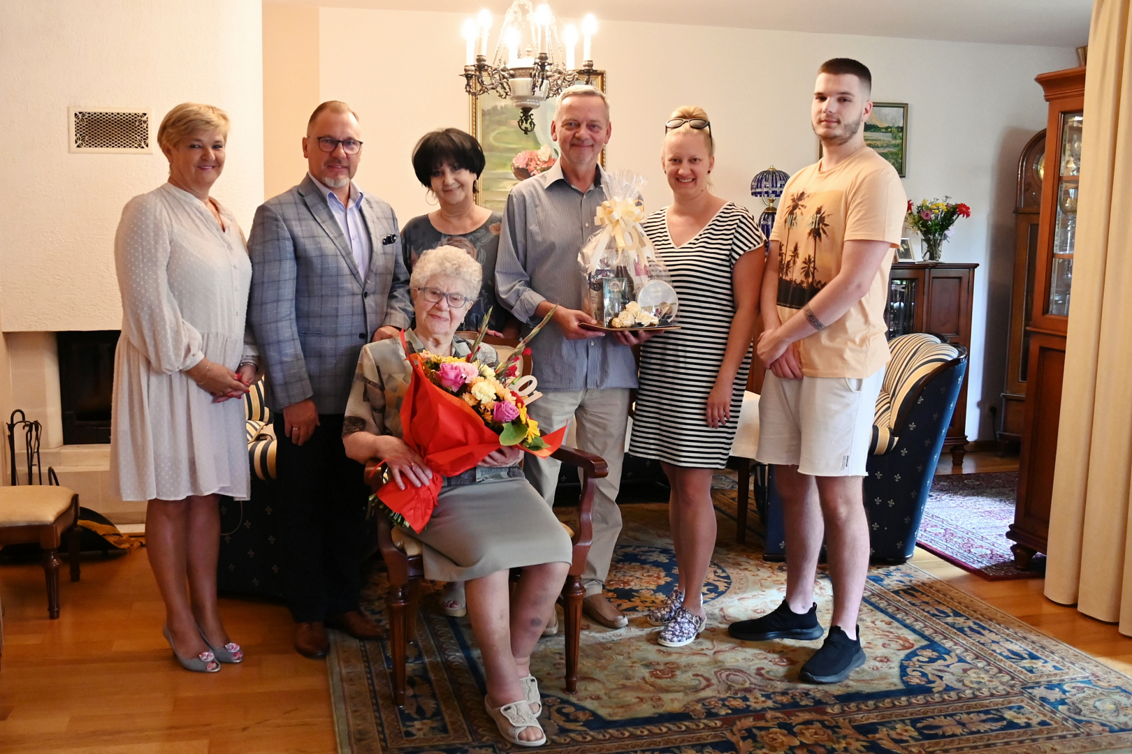 Goście z Urzędu Miejskiego w imieniu władz samorządowych złożyli Jubilatce urodzinowe życzenia, wręczając Jej bukiet kwiatów i symboliczny upominek.