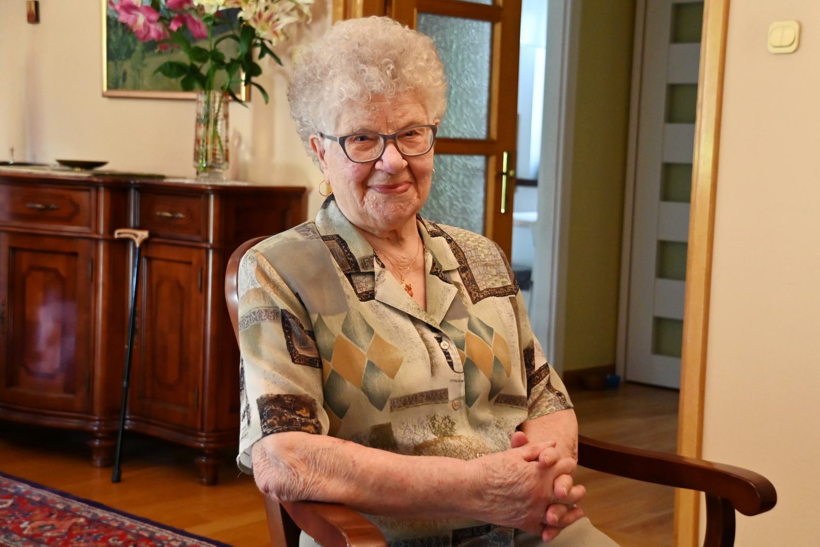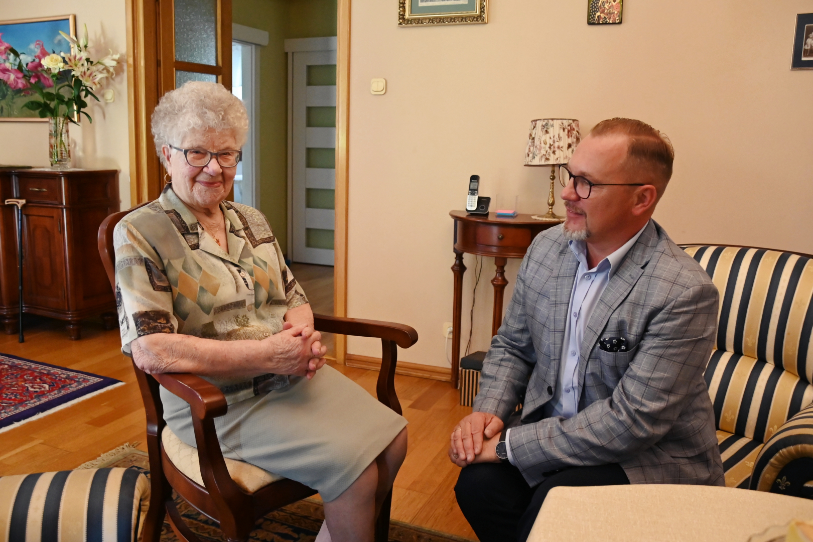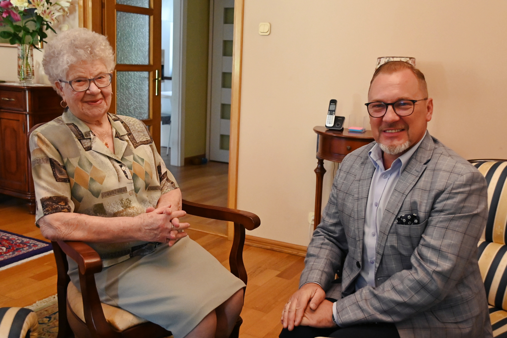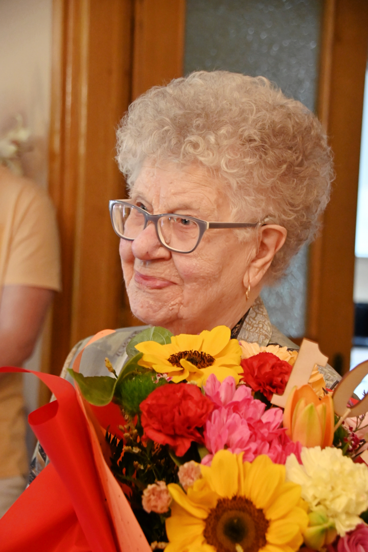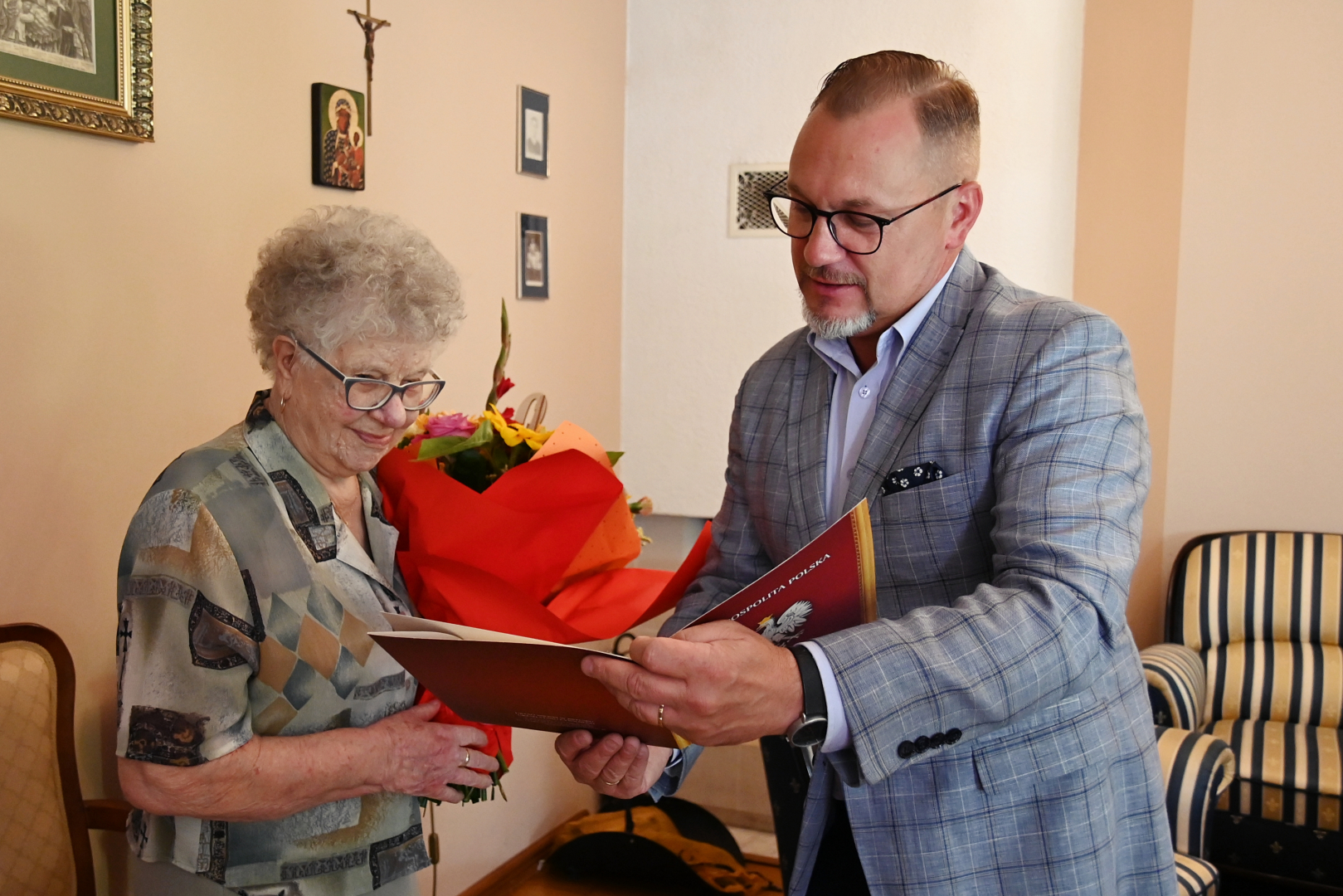 Goście z Urzędu Miejskiego w imieniu władz samorządowych złożyli Jubilatce urodzinowe życzenia, wręczając Jej bukiet kwiatów i symboliczny upominek.
