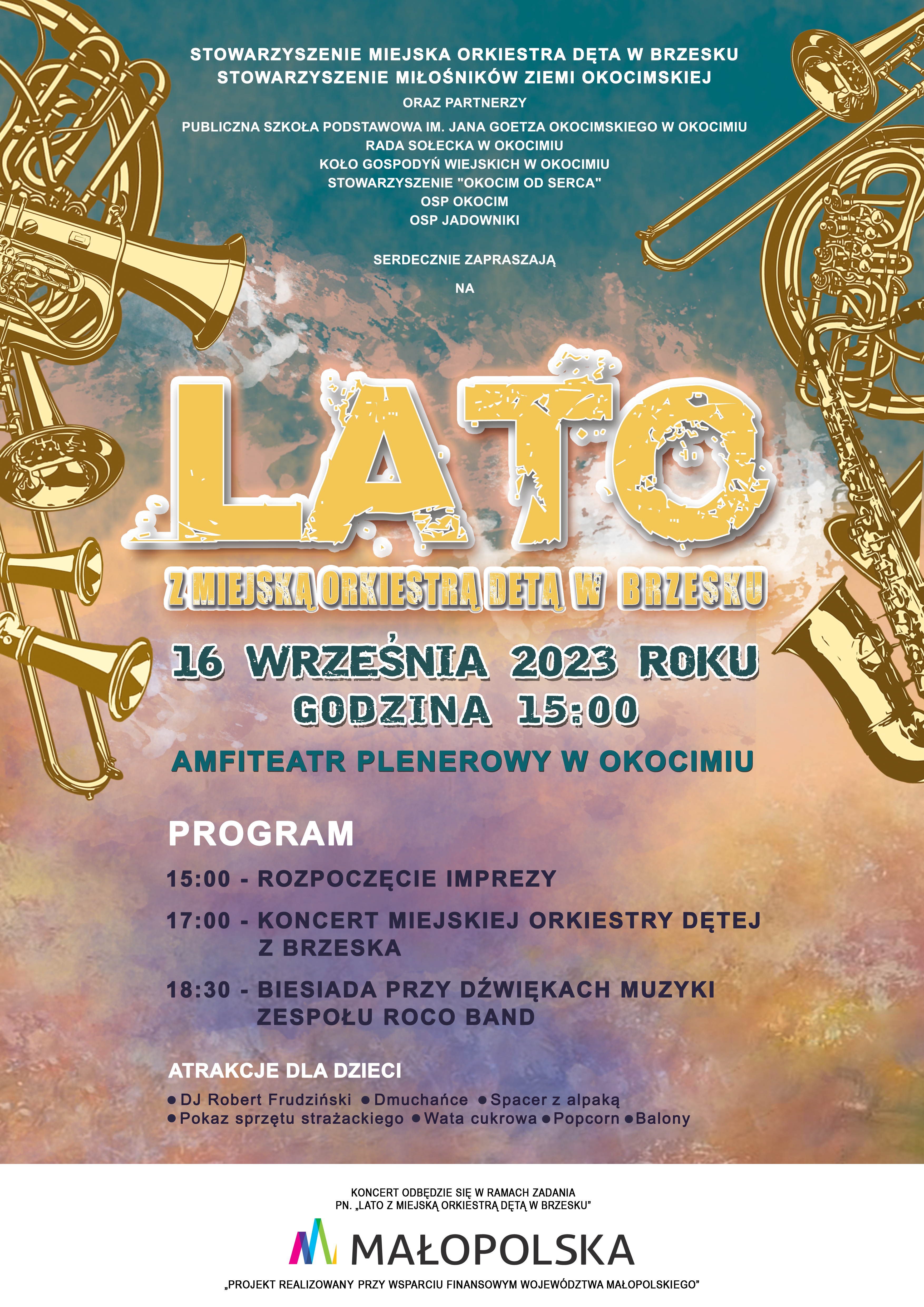 Zapraszamy na koncert Miejskiej Orkiestry Dętej z Brzeska, który odbędzie 16 września (sobota) w amfiteatrze w Okocimiu. Szczegóły na plakacie.