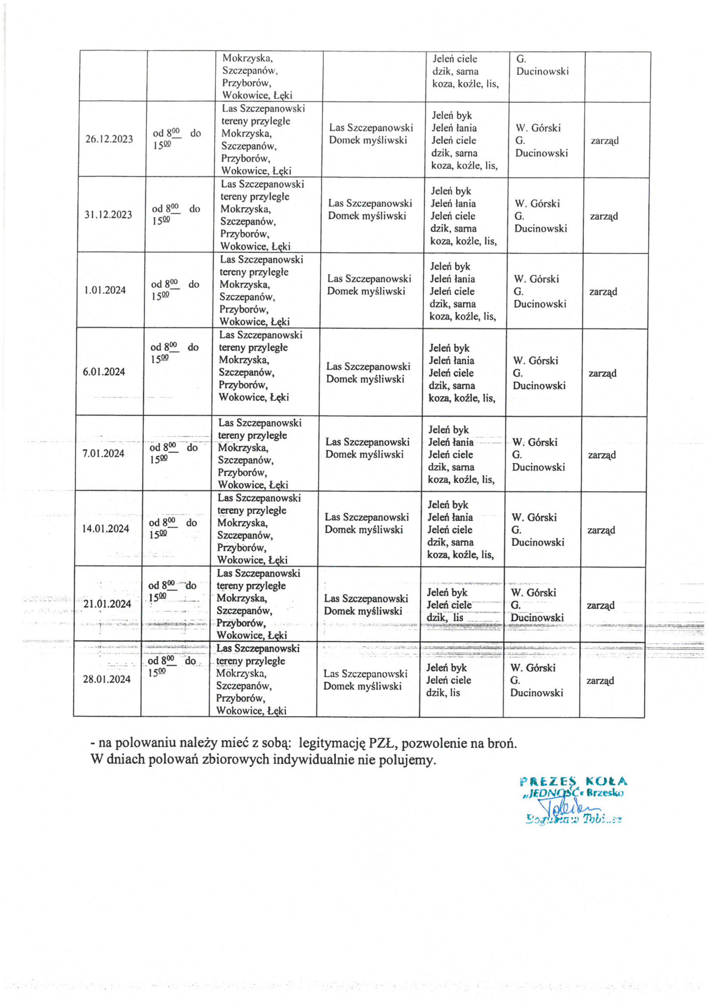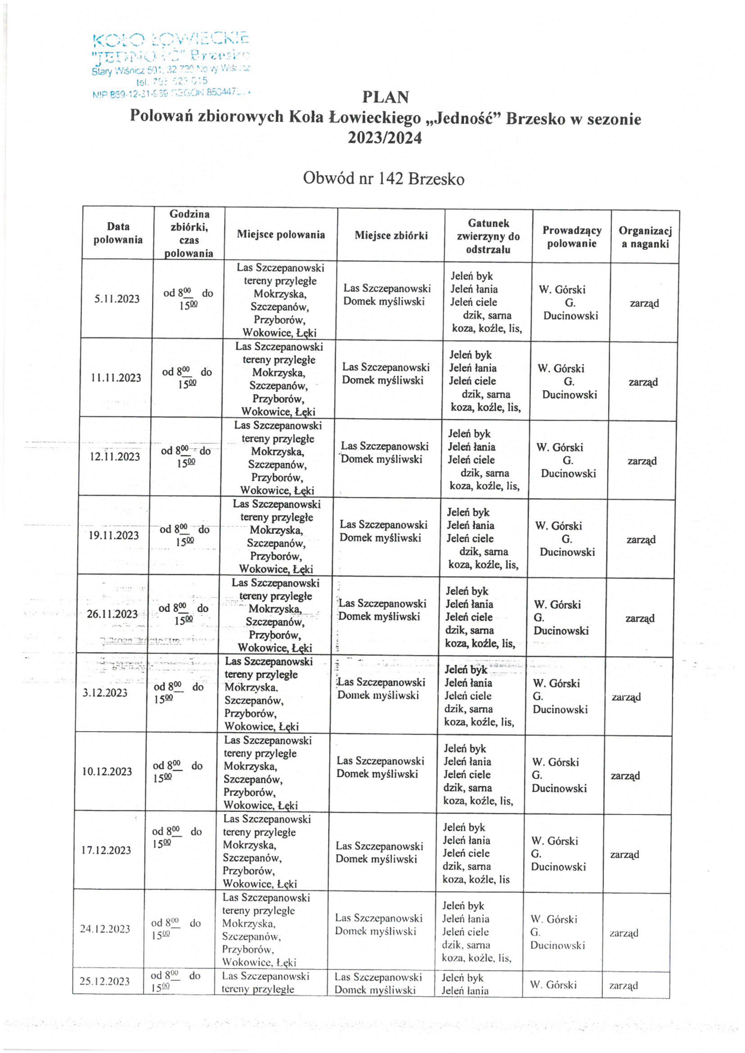 podaje do publicznej wiadomości terminy polowań zbiorowych w obwodzie nr 142 dzierżawionym przez Koło Łowieckie „JEDNOŚĆ ” Brzesko, w sezonie łowieckim 2023/2024.