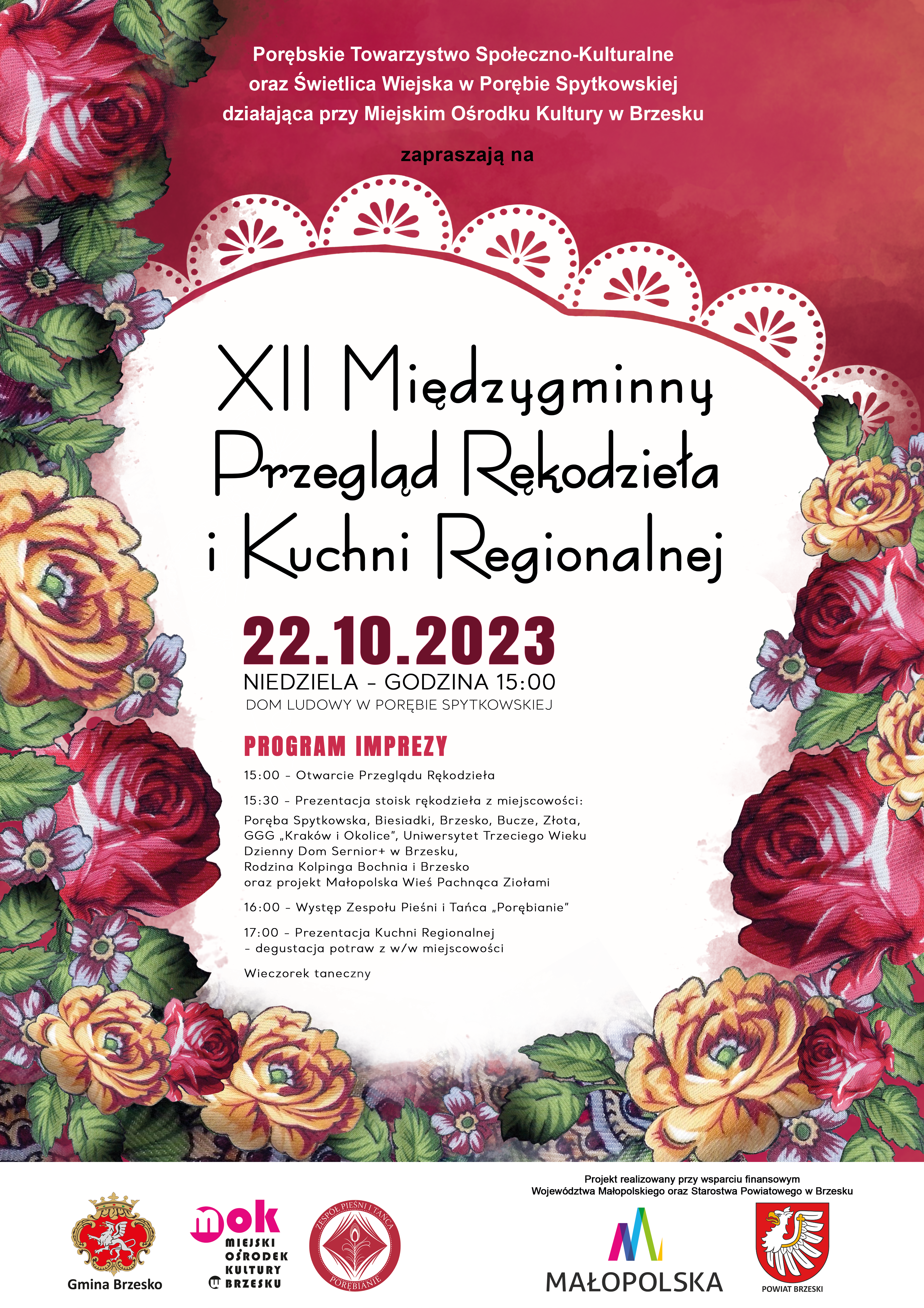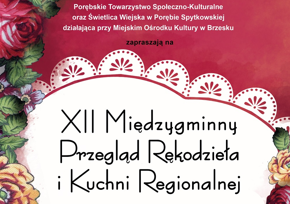 Porębskie Towarzystwo Społeczno-Kulturalne oraz Świetlica Wiejska w Porębie Spytkowskiej działającą przy Miejskim Ośrodkiem Kultury zapraszają na XII Międzygminny Przegląd Rękodzieła i Kuchni Regionalnej, który odbędzie się 22 października w Domu Ludowym w Porębie Spytkowskiej. Szczegóły na plakacie.