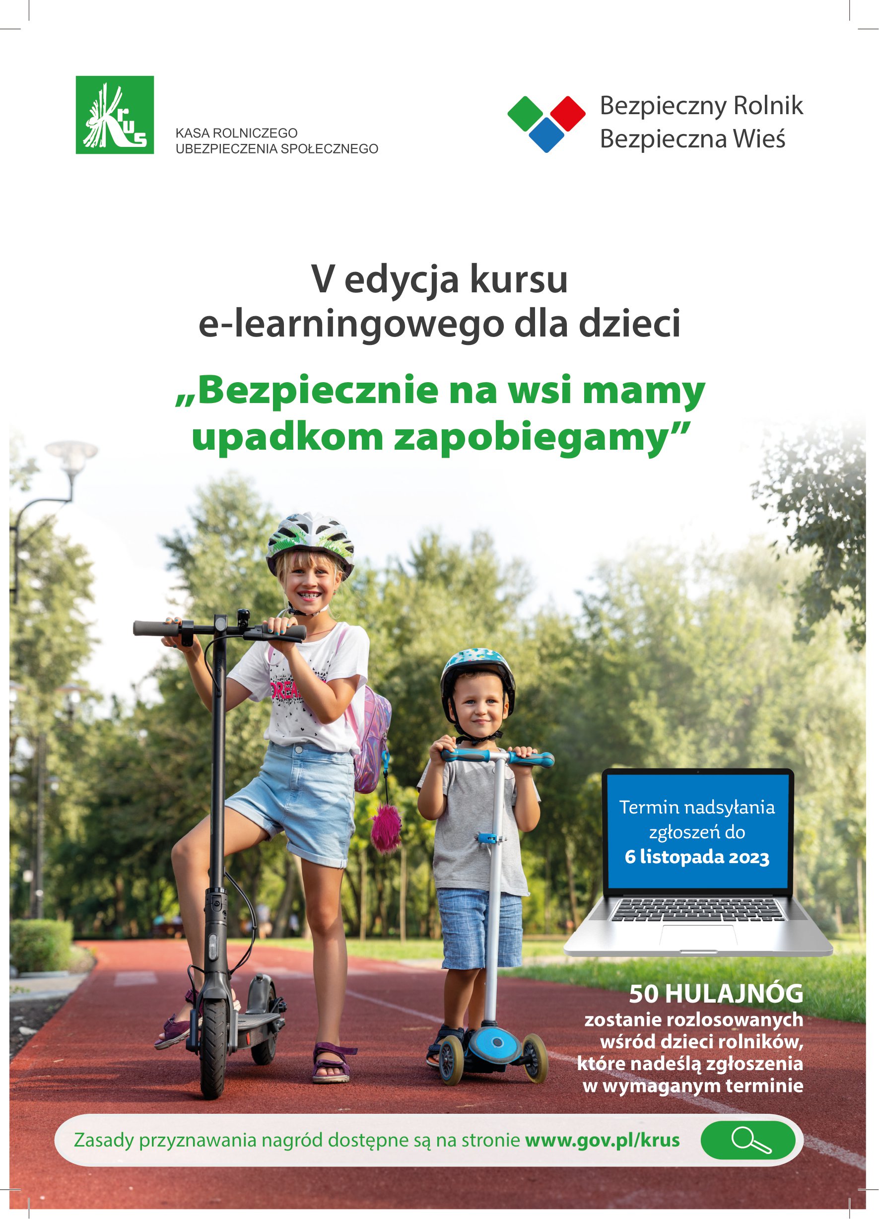 Zasady przyznawania hulajnóg dla dzieci, które wykonują kurs e-learningowy pt.: „Bezpiecznie na wsi mamy – upadkom zapobiegamy” dostępne są na stronie http://www.gov.pl/krus