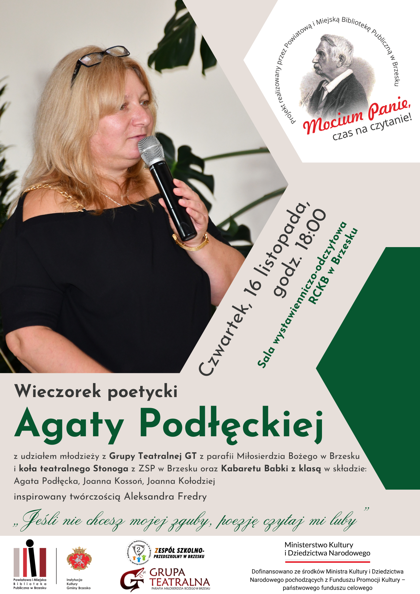 Powiatowa i Miejska Biblioteka Publiczna zaprasza na wieczorek poetycki Agaty Podłęckiej inspirowany twórczością Aleksandra Fredry w roku 230. rocznicy jego urodzin. Brzeskiej poetce towarzyszyć będzie młodzież z Grupy Teatralnej GT z parafii Miłosierdzia Bożego w Brzesku i koła teatralnego Stonoga z ZSP w Brzesku oraz Joanna Kossoń i Joanna Kołodziej, z którymi współtworzy Kabaret Babki z klasą. Wspólnie udowodnią, że poezja jest nam wszystkim bardzo potrzebna, gdyż – parafrazując Fredrę – „Jeśli nie chcesz mojej zguby, poezję czytaj mi luby”.