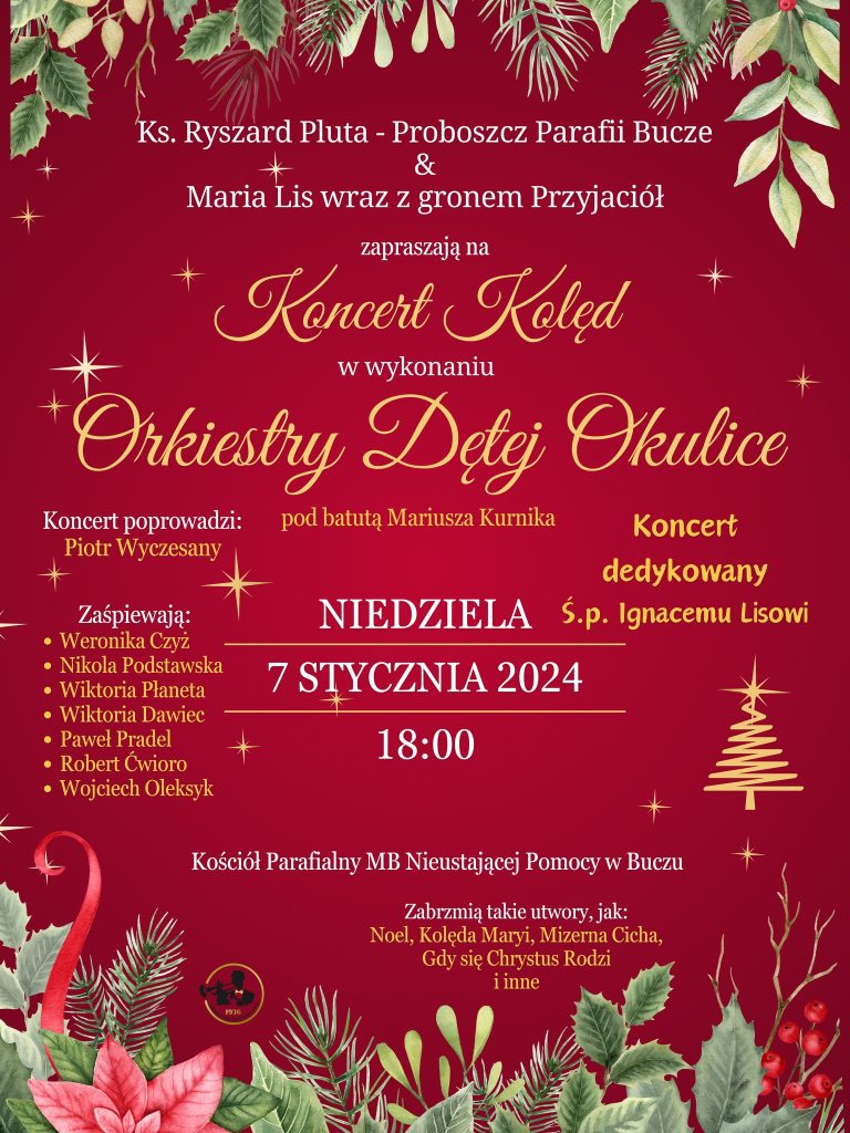 W niedzielę, 7 stycznia, o godzinie 18.00, w kościele pw. MB Nieustającej Pomocy w Buczu odbędzie się koncert w wykonaniu Orkiestry Dętej z Okulic pod dyrekcją Mariusza Kurnika. Zabrzmią najpiękniejsze polskie i zagraniczne kolędy.