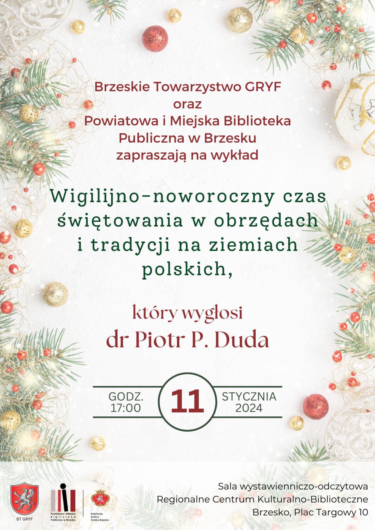 Powiatowa i Miejska Biblioteka Publiczna w Brzesku oraz Brzeskie Towarzystwo GRYF zapraszają na wykład „Wigilijno-noworoczny czas świętowania w obrzędach i tradycji na ziemiach polskich”, który wygłosi brzeski historyk dr Piotr Duda. Prelekcja odbędzie się w czwartek, 11 stycznia, o godzinie 17:00 w Sali wystawienniczo-odczytowej RCK-B. Jest to kolejne już wydarzeniem organizowane wspólnie przez bibliotekę i stowarzyszenie.