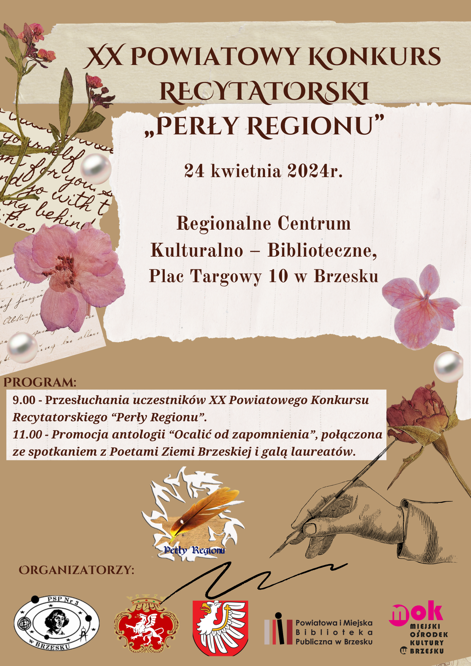 Zapraszamy na jubileuszowy XX Powiatowy Konkurs Recytatorski "Perły Regionu" który odbędzie się już 24 kwietnia 2024 r. Konkurs został połączony ze spotkaniem z lokalnymi poetami oraz promocją antologii "Ocalić od zapomnienia". To będzie inspirujące przedpołudnie.