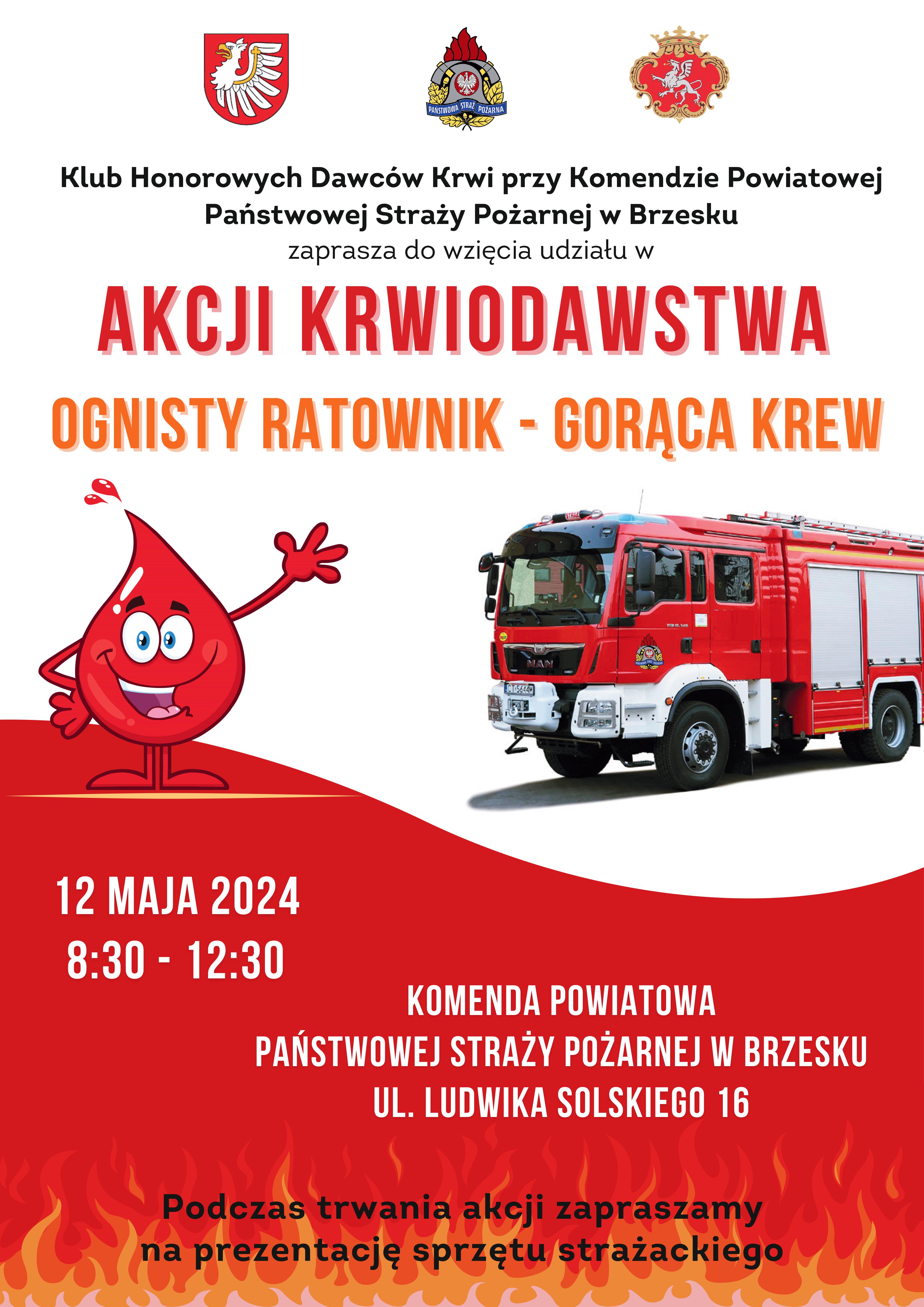 Serdecznie zapraszamy na akcję krwiodawstwa organizowaną w dniu 12 maja 2024 r. przez Klub Honorowych Dawców Krwi przy Komendzie Powiatowej PSP w Brzesku.