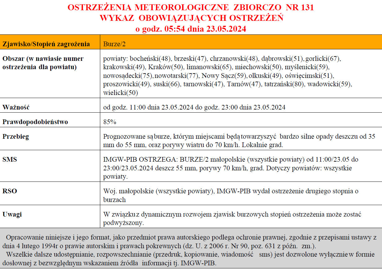 Prognozowane są burze, którym miejscami będą towarzyszyć bardzo silne opady deszczu od 35 mm do 55 mm, oraz porywy wiatru do 70 km/h. Lokalnie grad.