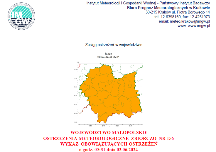 Przebieg Prognozowane są burze, którym miejscami będą towarzyszyć bardzo silne opady deszczu do 30 mm, a punktowo do 45 mm, oraz porywy wiatru do 80 km/h. Lokalnie grad.