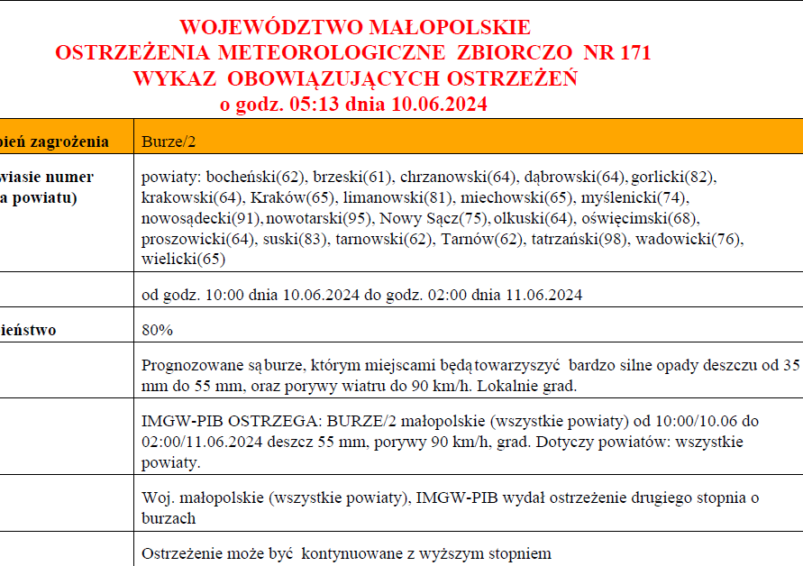 Przebieg Prognozowane są burze, którym miejscami będą towarzyszyć bardzo silne opady deszczu od 35 mm do 55 mm, oraz porywy wiatru do 90 km/h. Lokalnie grad.