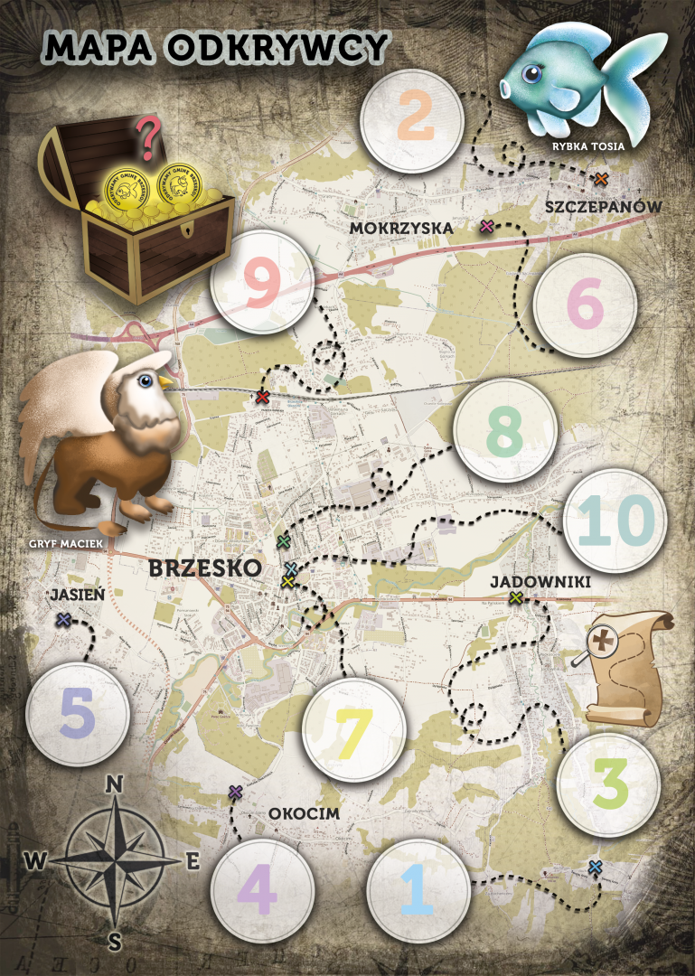 Zasady udziału w grze są bardzo proste. Pierwszym krokiem jest zaopatrzenie się w mapę (można ją pobrać ze strony internetowej brzesko.pl oraz mok-brzesko.pl, albo odebrać osobiście w Urzędzie Miejskim (pokój nr 13) lub w RCKB (portiernia). Przed wyruszeniem w trasę warto zabrać ze sobą długopis i notesik (do rozwiązywania zadań), a w jednym przypadku niezbędny będzie też kompas (klasyczny lub w telefonie). Miejsca oznaczone cyframi od 1 do 9 można „odkrywać” w dowolnej kolejności. Nie jest też powiedziane, że całą trasę musi się zaliczyć w ciągu jednego dnia. Podróż po naszej pięknej gminie można rozłożyć w czasie. Ważne jest tylko to, żeby ostatnim miejscem naszej wędrówki było regionalne Centrum Kulturalno-Biblioteczne w Brzesku, w którym będzie można zweryfikować poprawność wykonywanych zadań, a fakt otrzymania tytułu „Odkrywca Gminy Brzesko” utrwalić za pomocą fotografii na tle specjalnej ścianki. Każdy uczestnik, który dotrze do mety, otrzyma okolicznościowy medal. Życzymy powodzenia!